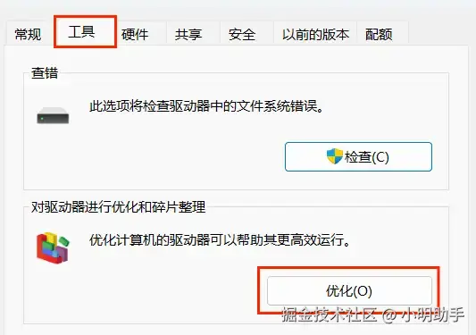 第三步:右键点击C盘,选择【属性】,在弹出的窗口中选择【工具】,点击【优化】按钮。