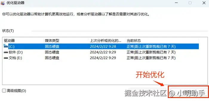 第四步:在弹出的【优化驱动器】窗口中,选择需要优化的磁盘,点击右下角的【优化】开始进行垃圾文件和磁盘碎片的清理。
