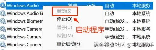 第二步:找到【Windows Audio】服务,确保其状态为【正在运行】。如果服务未运行,选中服务,右键点击服务,在下拉列表中选择【启动】。