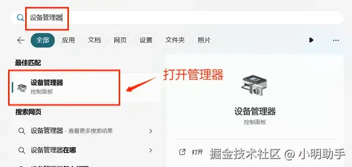 第一步:按下Windows徽标键,唤出【开始】菜单,搜索【设备管理器】并打开。