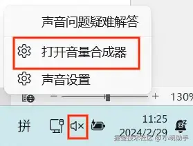 第一步:在任务栏右下角找到音量图标,右键点击图标,选择【打开音量合成器】。