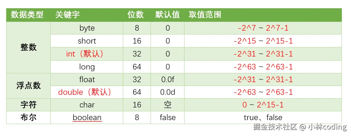 8种基本数据类型的默认值、位数、取值范围,如下表所示: