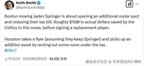NBA记者Keith Smith更新推特,他谈到了这笔交易:“凯尔特人交易走斯普林格主要是为了腾出一个阵容名额并减少奢侈税开支。通过这笔操作,凯尔特人实际节省了大约1500万(在签下一名替代球员之前)。而火箭队则利用薪资空间尝试刮一刮斯普林格这张彩票(假设他们选择留下他),同时通过这笔交易获得了额外的资产。”