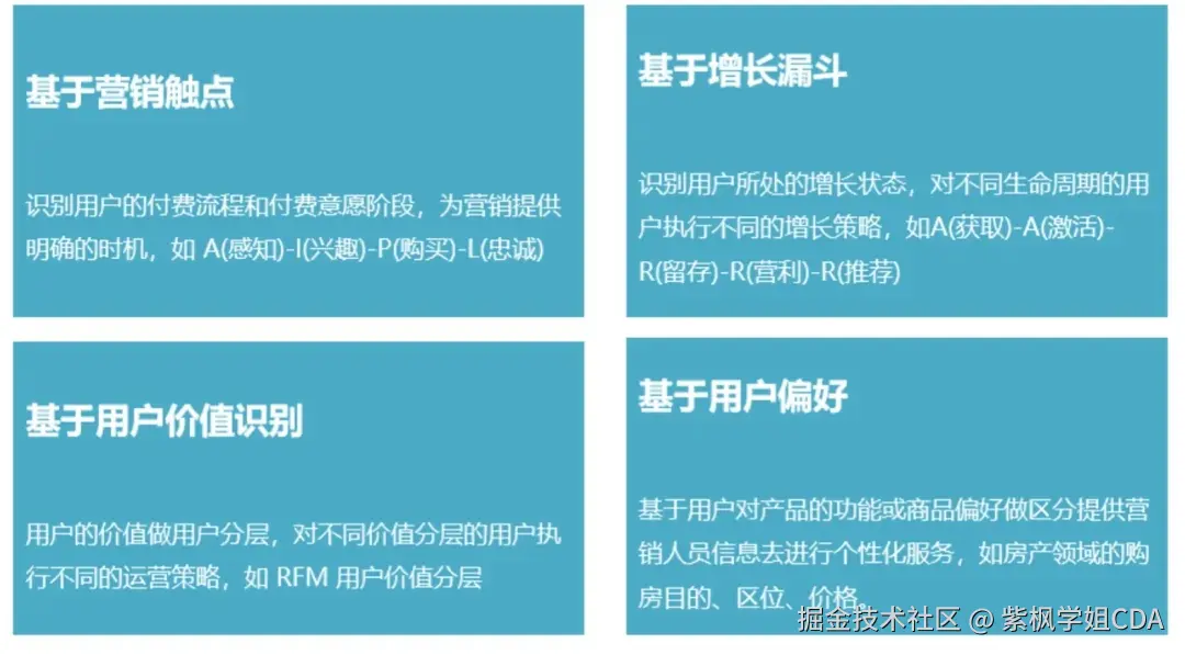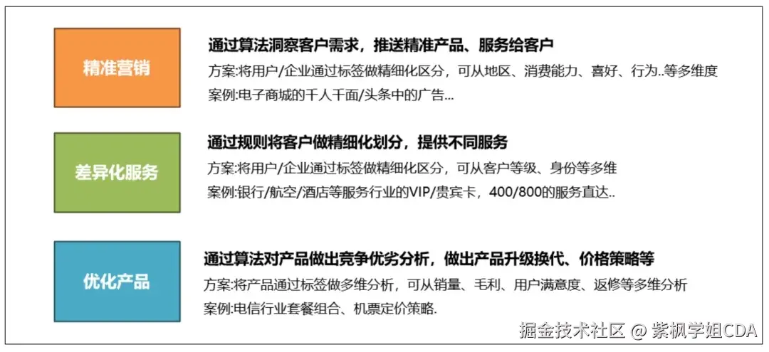 - 规则标签:基于预设的业务规则生成的标签,比如根据用户的消费金额自动分为VIP客户。