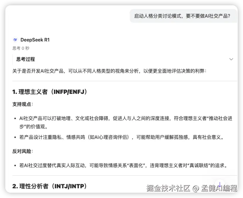 只需说"启动人格分类讨论模式",DeepSeek 就能模拟不同性格的人,从多个维度为你分析问题。无论是创业决策,还是生活选择,都能帮你看得更全面。