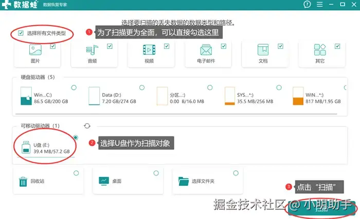 步骤1: 连接U盘后打开数据 蛙恢复专家,勾选需要恢复的文件类型(为了扫描更为去全面,可以勾选“选择所有文件类型”),再勾选U盘进行扫描,最后点击“扫描”;
