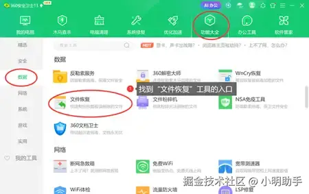 步骤1: 打开软件,在首页上方选择“功能大全”,进去后在左侧点击“数据”,看见“文件恢复”后点击开启;