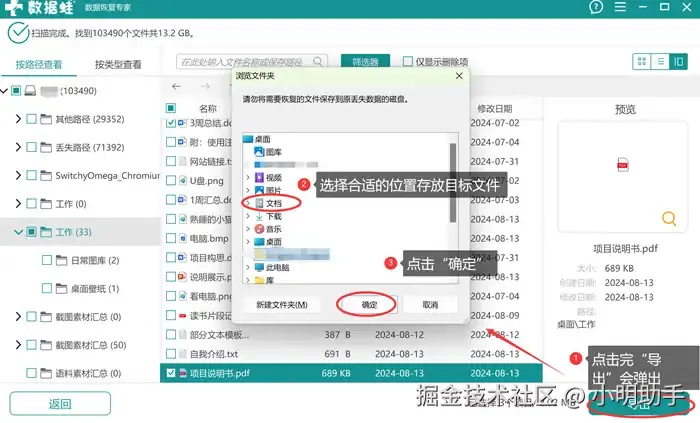 步骤3: 最后再为恢复文件选好存放的位置(千万不能放入原先的位置),静待片刻,完成数据恢复。