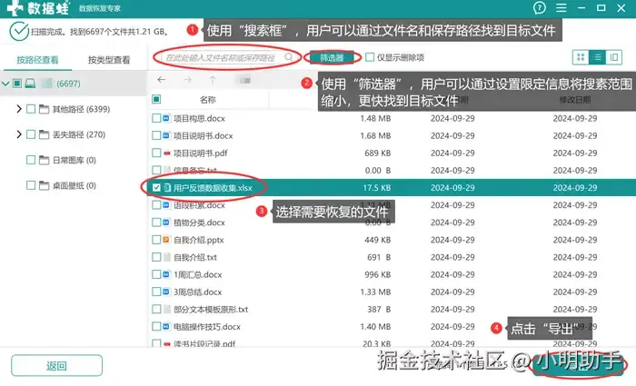 步骤2: 在软件显示‘扫描完成’后,在软件页面中间寻找自己需要恢复的文件,然后点击“导出”;如果想要更高效率地找到目标文件,可以使用上方的“搜索框”“筛选器”等辅助工具;