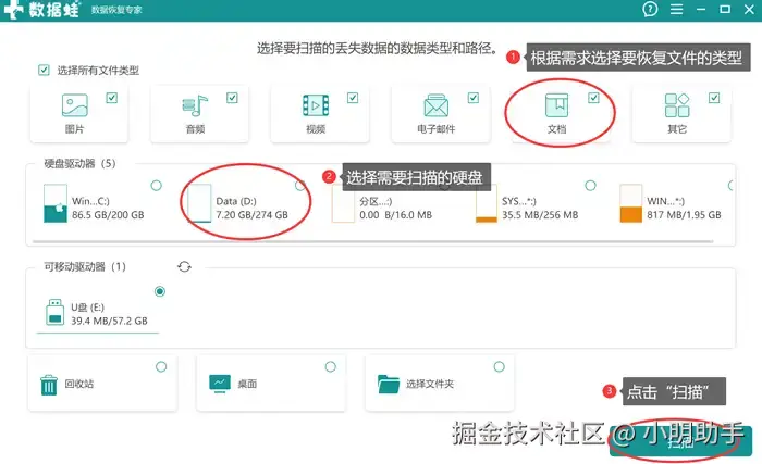 步骤1: 在电脑里开启数据 蛙恢复专家,进入软件主页面后,用户能发现可以自由选择需要恢复的文件类型和扫描位置;选择需要扫描的类型和硬盘后,单击“扫描”;