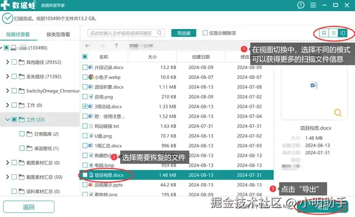 步骤2: 等待深度扫描结束后,选择自己需要恢复的文件后点击“导出”;