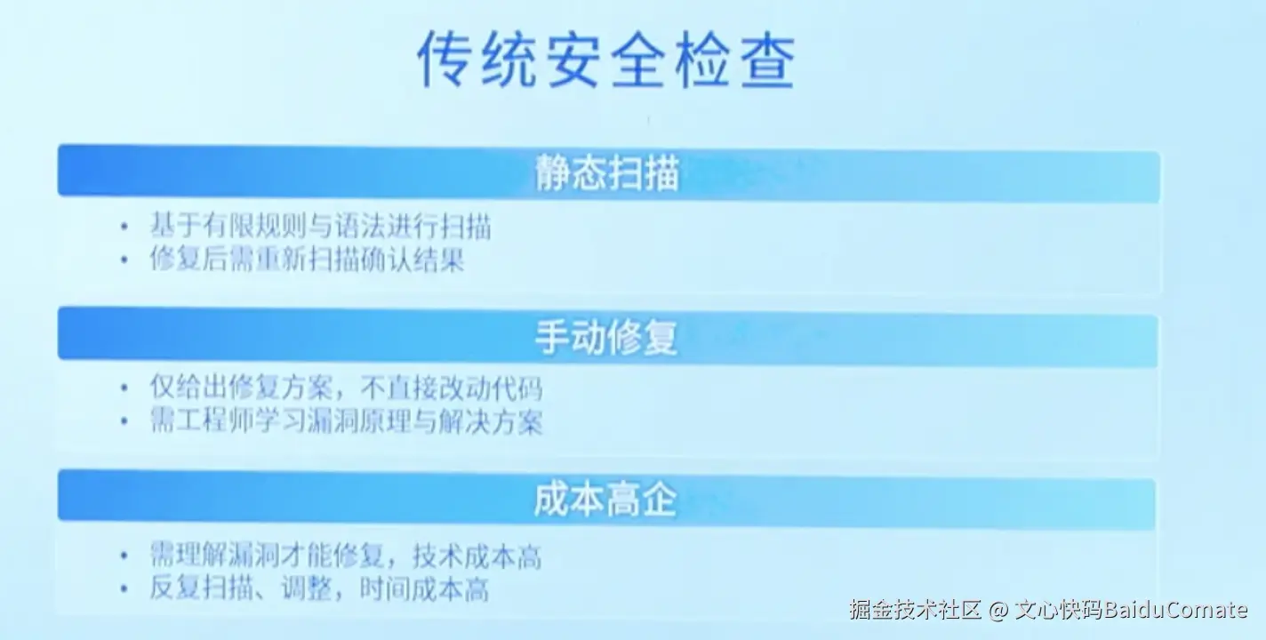 只告诉你有这个问题,你怎么去把这个问题解决?还得你人去解决,所以我们要手动去修复,那手动修复呢?就需要工程师去理解这个漏洞是什么,怎么来的,要怎么去解决,然后去写代码。因此它的成本一定程度上是比较高的。包括工程师去理解的这个精力成本,包括我漏洞修了以后,你待会我还要再反复去扫描,看看问题还在不在的时间成本。