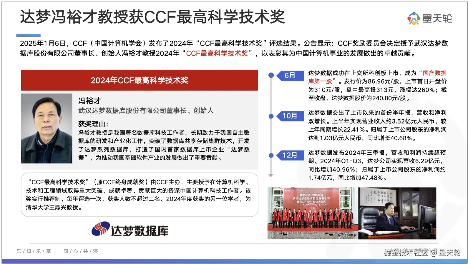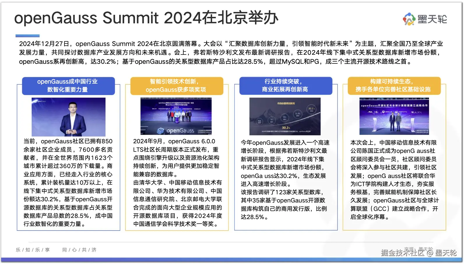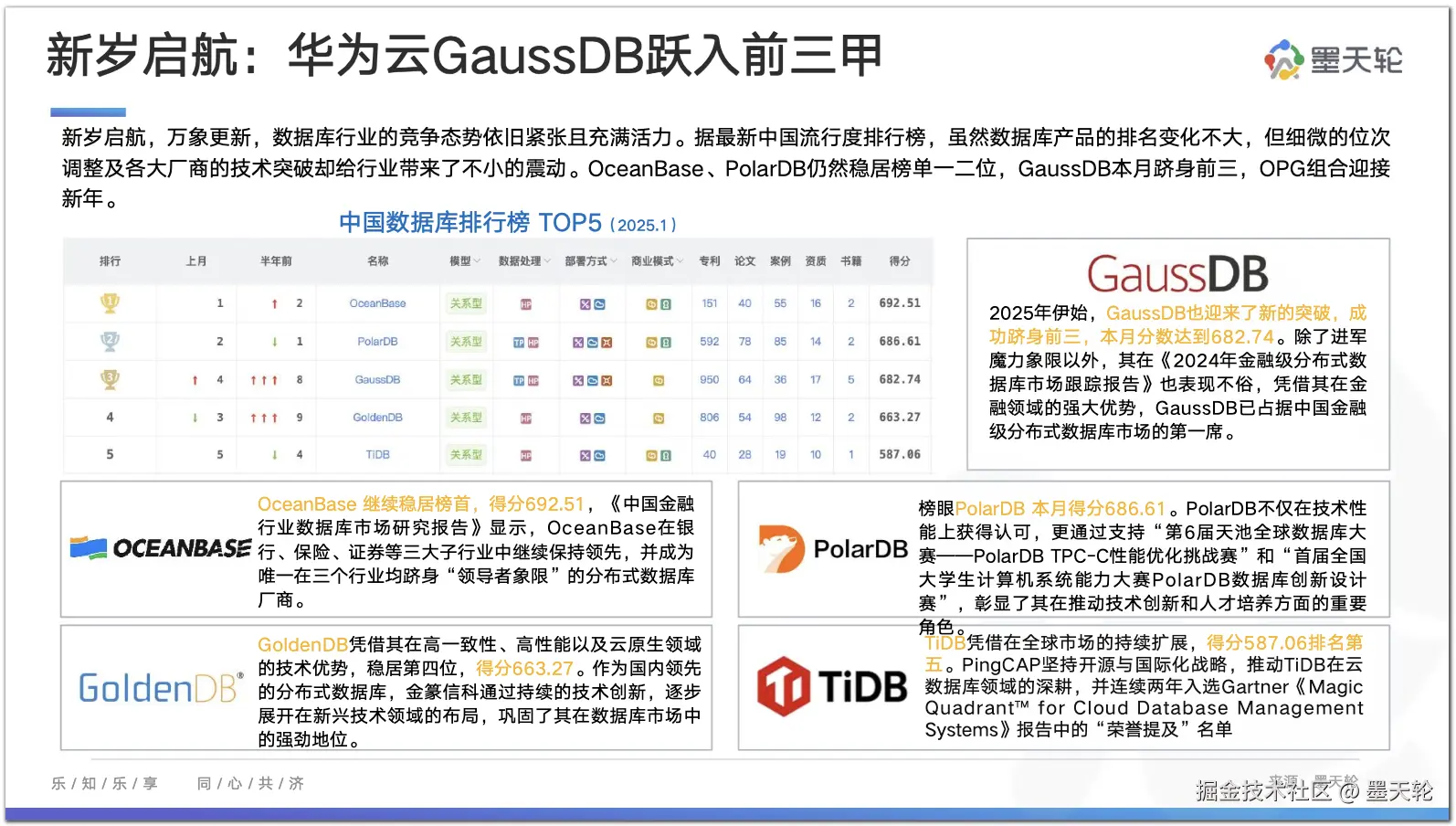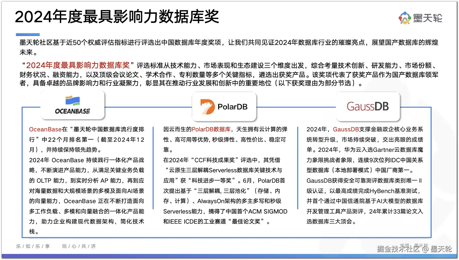 2024年12月,数据库社区墨天轮发布“2024年度数据库”获奖名单,旨在表彰年度在技术创新、市场表现和行业影响力方面表现突出的数据库产品与厂商,其中,OceanBase、阿里云PolarDB、华为GaussDB荣获“2024年度最具影响力数据库奖”,让我们一同见证荣耀时刻。