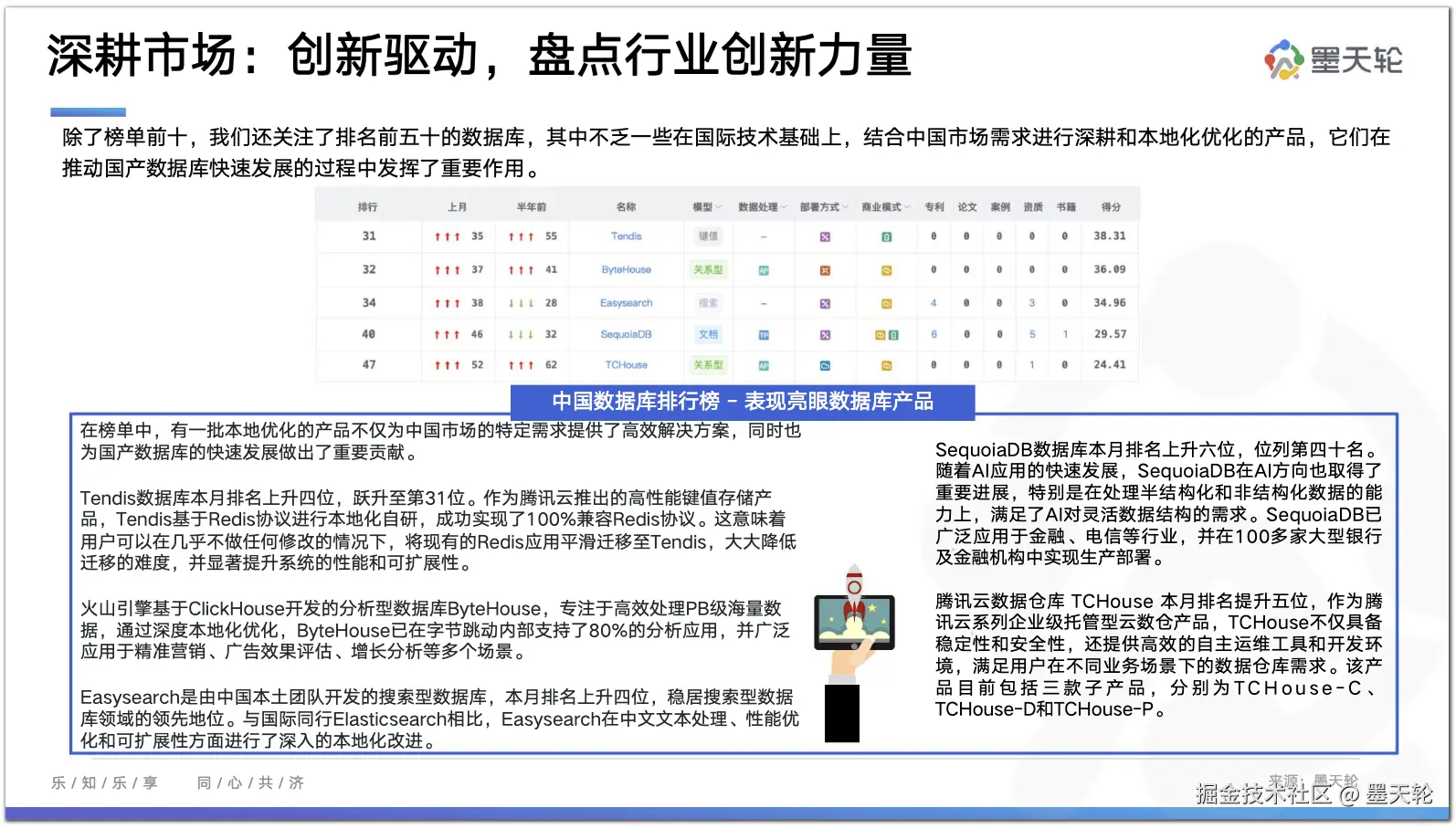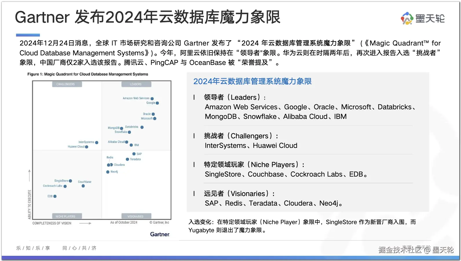 Gartner 发布2024年云数据库魔力象限,中国仅有阿里云、华为云两家厂商入选报告;Databricks完成100亿美元融资,公司估值攀升至620亿美元。开放原子开源基金会公布“2024年度数据库领域国内活跃开源项目”名单,中国有9个项目入选其中…报告的第二章节汇集了最新、最热点的国内外数据库业内资讯。
