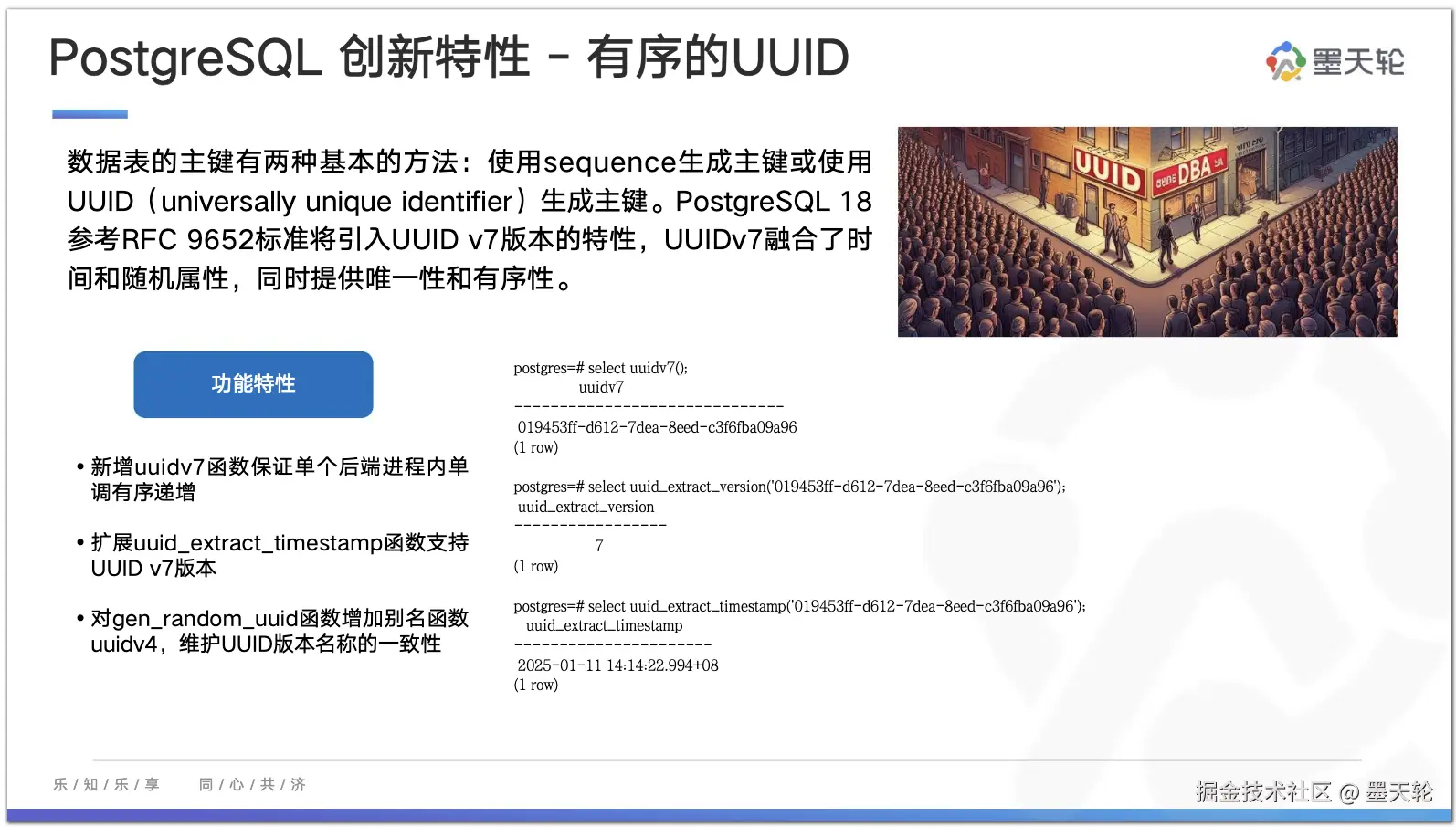 - PostgreSQL 18的有序UUID特性,通过新增函数等,提供唯一性和有序性,支持新版本