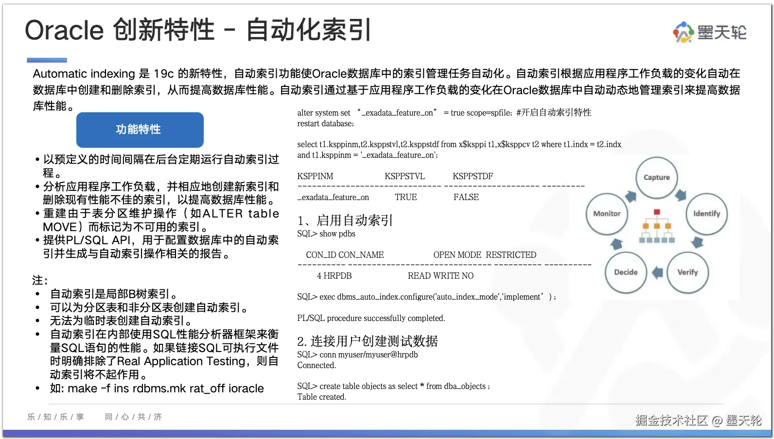 - Oracle的JSON Relational Duality实现了关系型与JSON处理方式的融合,通过视图自动同步数据,解决数据冗余和转换问题;其自动化索引功能则根据工作负载自动管理索引,提升性能