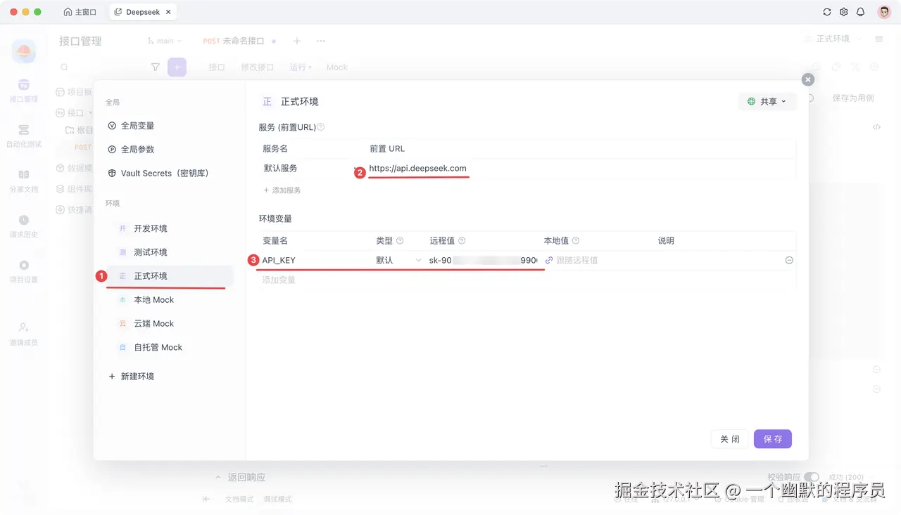 还有一种方法设置 API Key,在项目右上角的 “环境管理” 中,点击“正式环境”,这个环境变量的值就是上面创建的 Deepseek API 的 API Key,添加完成后保存即可。