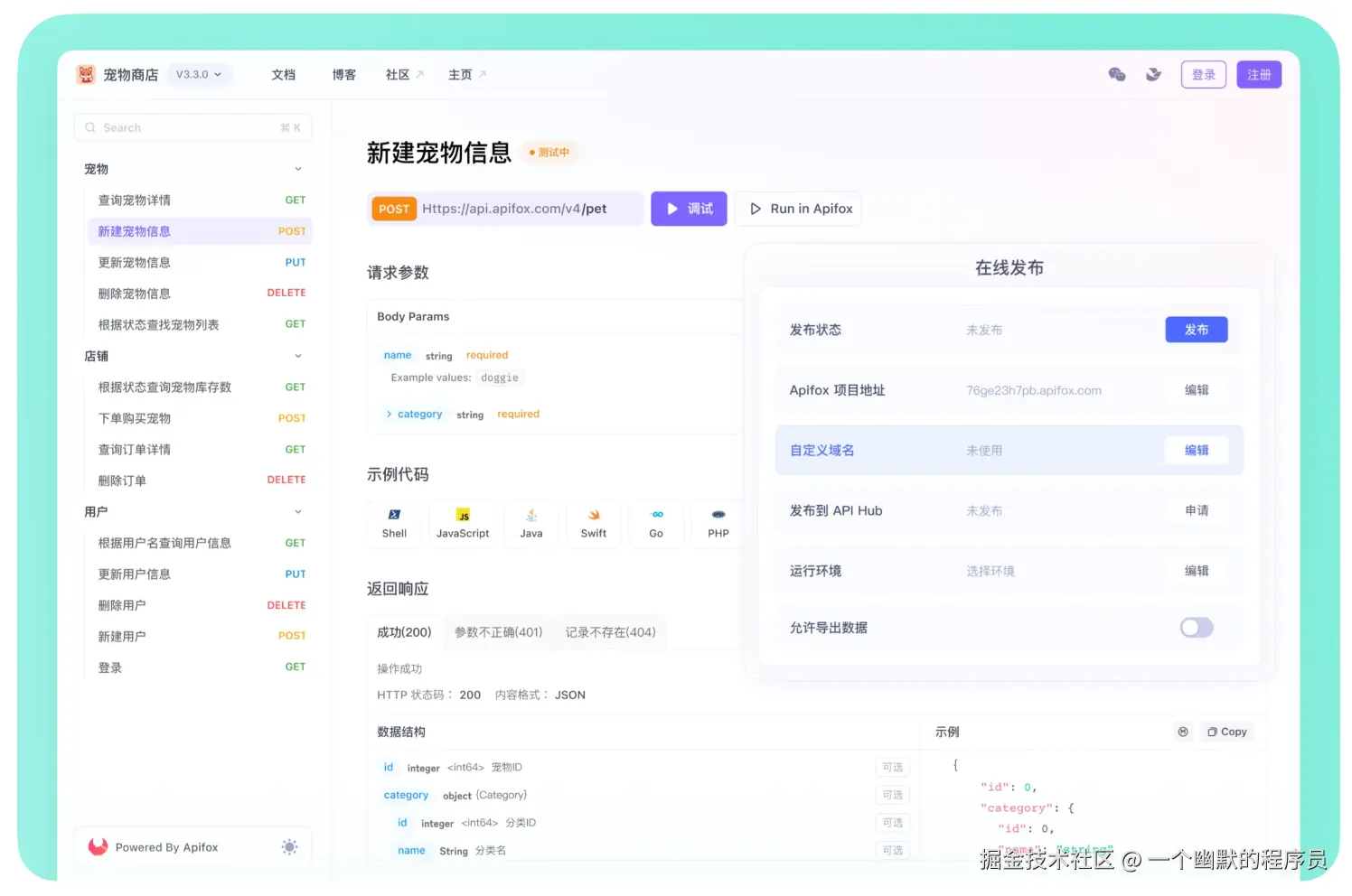 自动生成文档:Apifox 可以根据设计的 API 和模式自动生成 API 文档,内容全面,易于与团队成员和利益相关者共享。