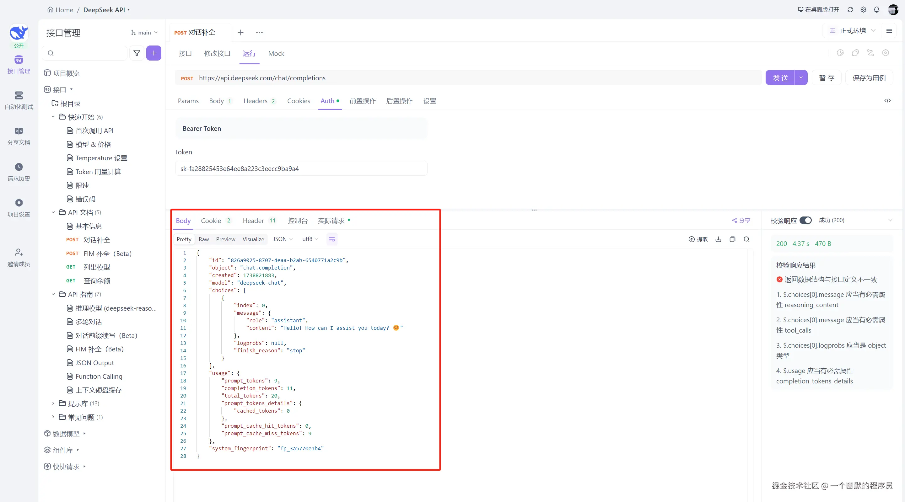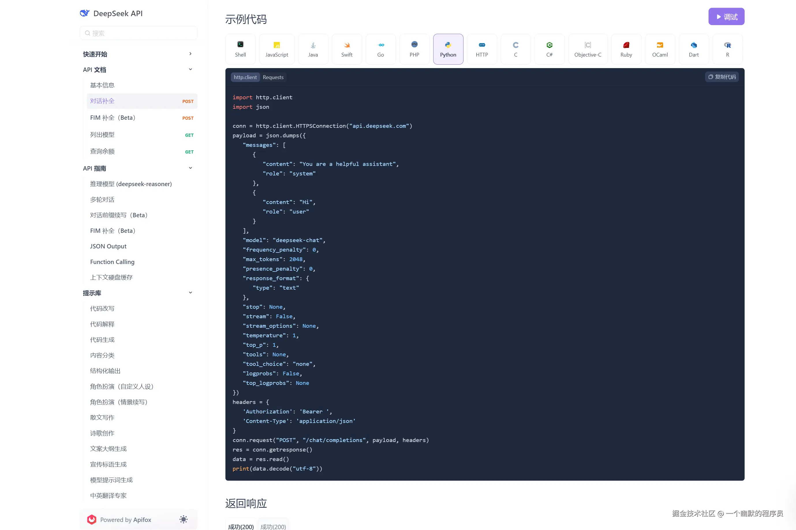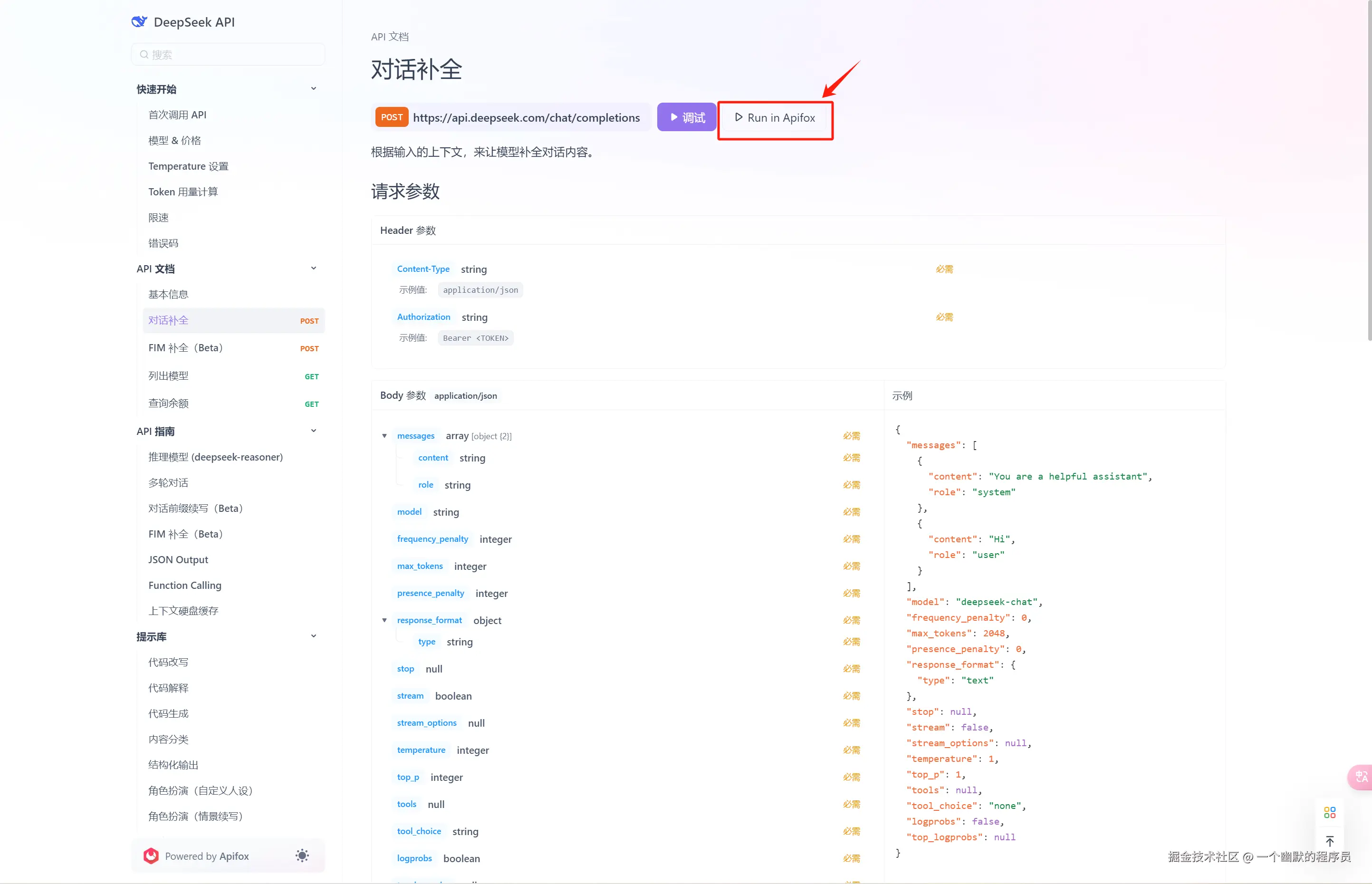 - 访问由 Apifox 创建的 DeepSeek 在线 API 文档。