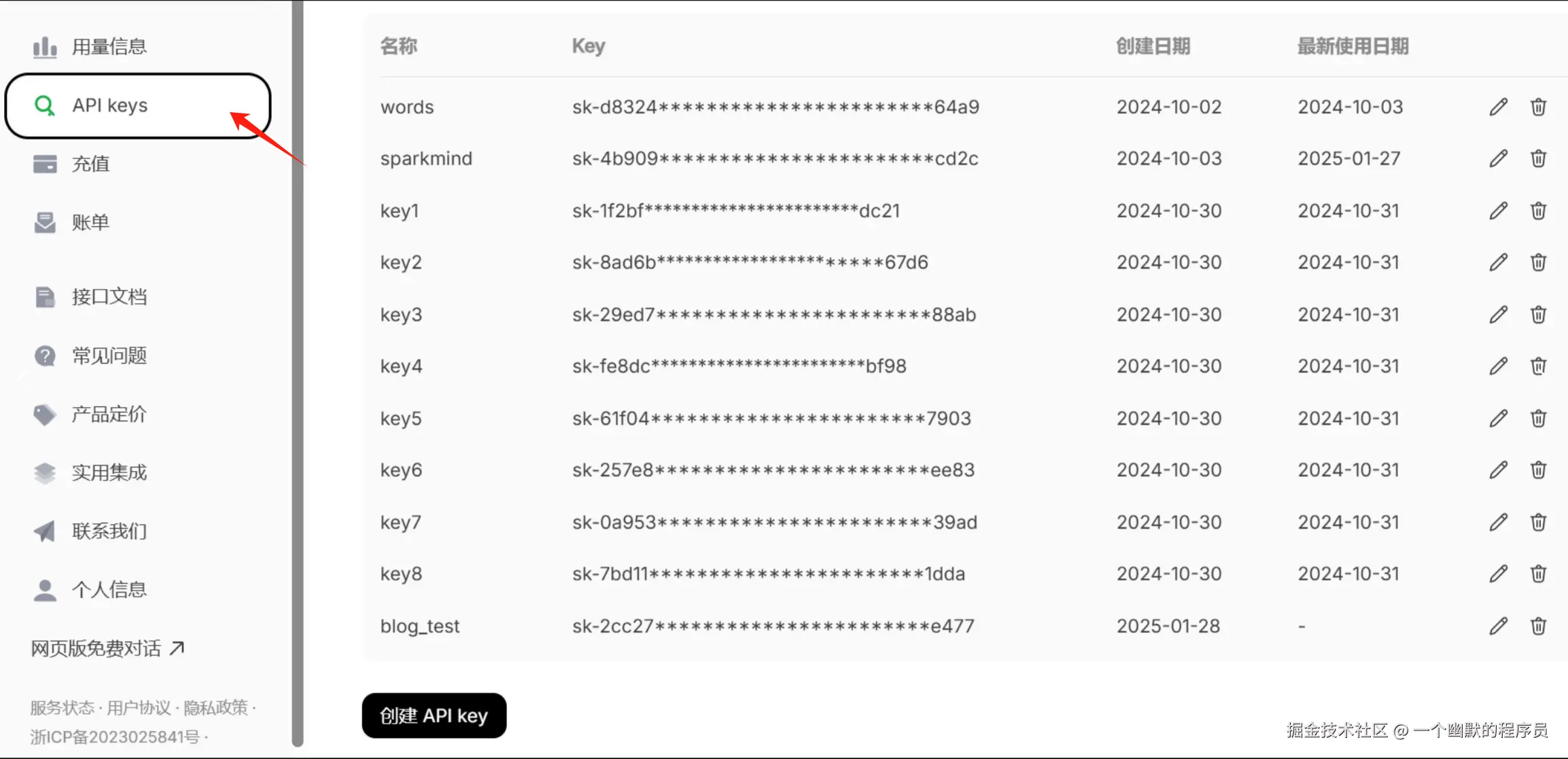 首先定位左侧边栏中的" API 密钥"选项,点击进入后即可生成一个全新的密钥。这时候你会看到你的 api key,这个只会显示一次,所以你可以将这个完整的 key 保存到记事本中。
