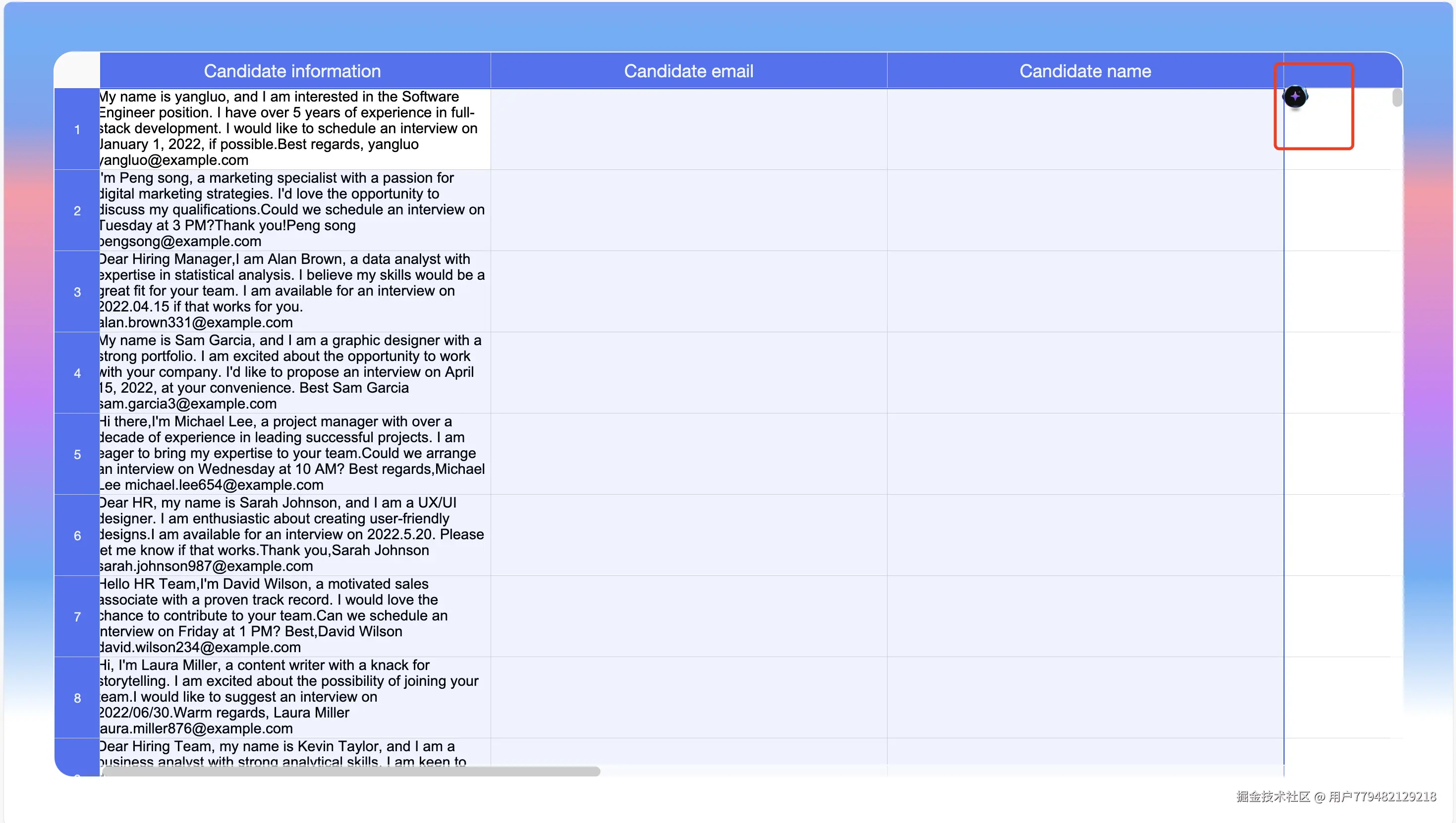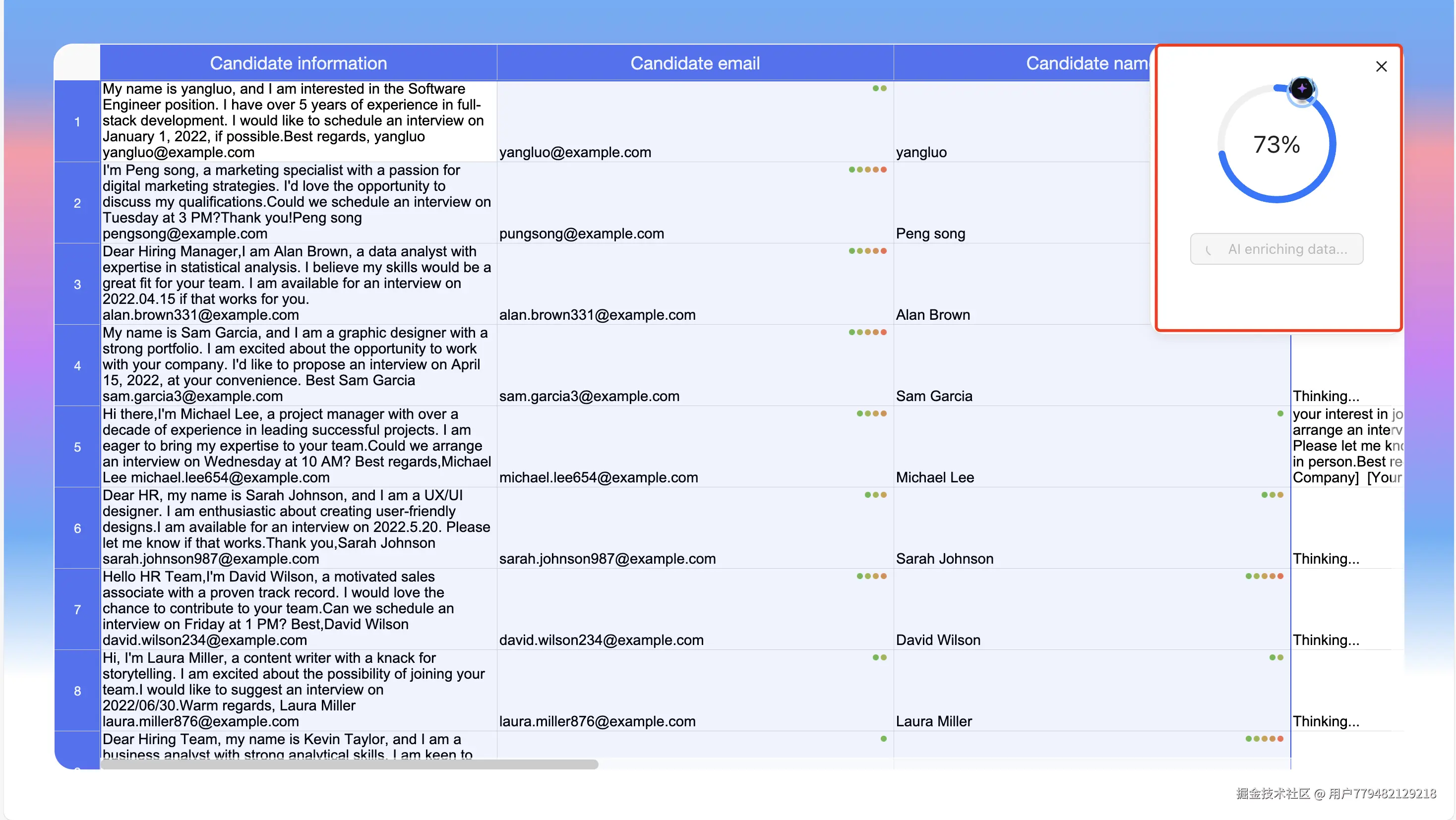 - 输入诸如 “Please extract the candidate's name, email address, and generate an email to be sent.” 这样的提示词,点击确定后等待分析,期间右上角会有进度提示,同时返回结果也将实时更新至单元格。