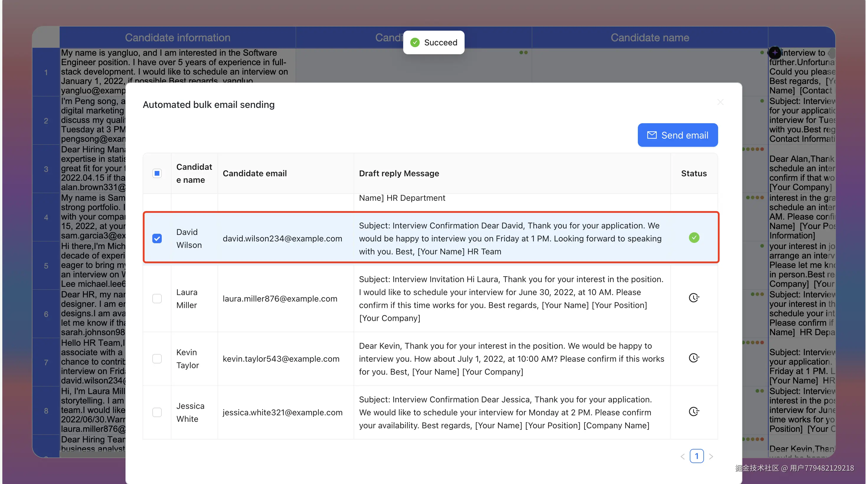 - 选中你想要发送的人,点击“发送邮箱” 并观察发送状态,发送成功或失败均有提示