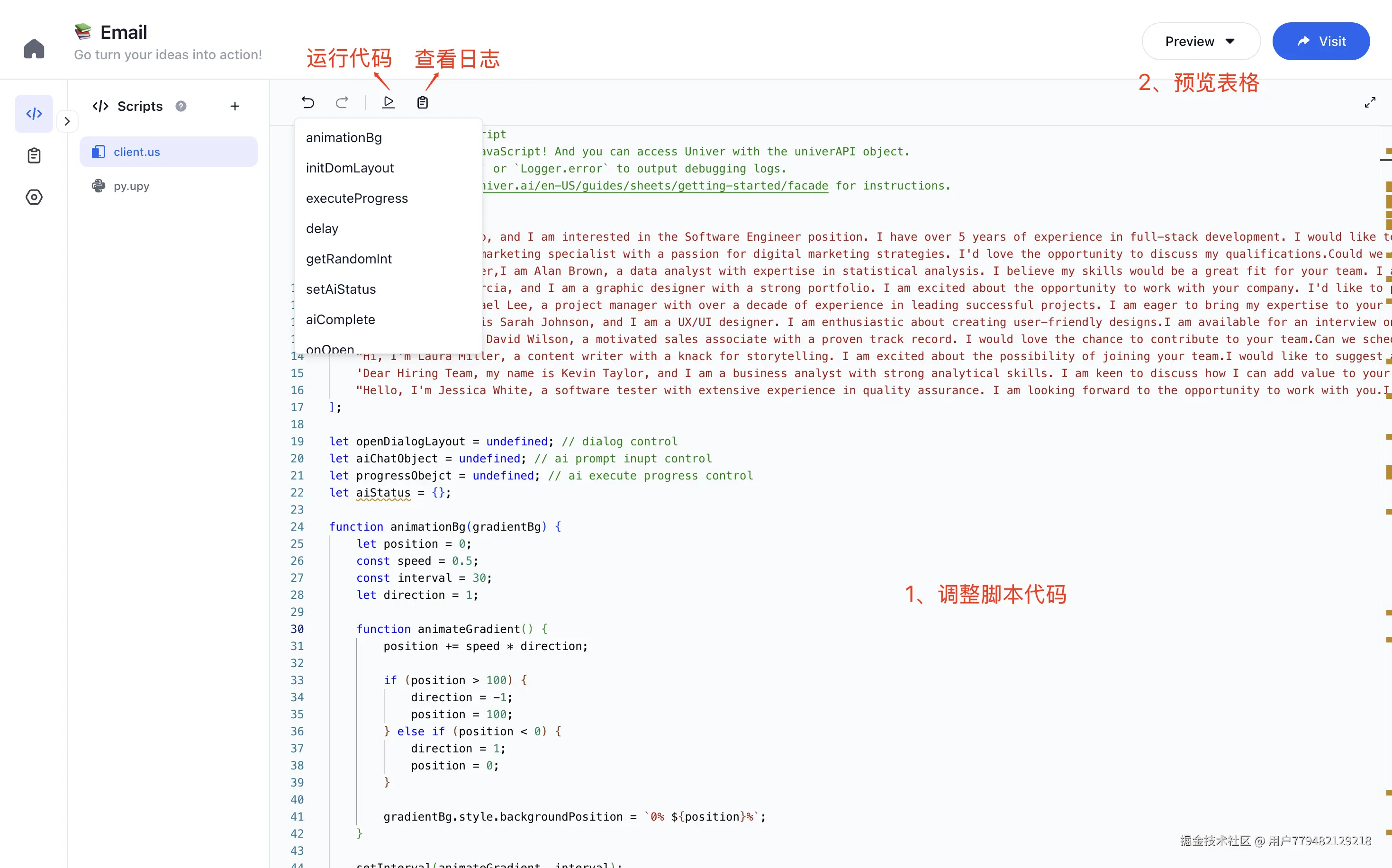 在 Univer Go 的操作界面中,您只需一键点击运行 AI Email 脚本,即可自动提取关键信息并发送邮件。不仅如此,Univer Go 还赋予了您对脚本进行深度自定义的能力,让您手中的工具真正为己所用,不管您是在应对复杂的业务流程,还是将创意工作设想变为现实,它都能精准匹配您的多元需求,高效又轻松地达成目标。