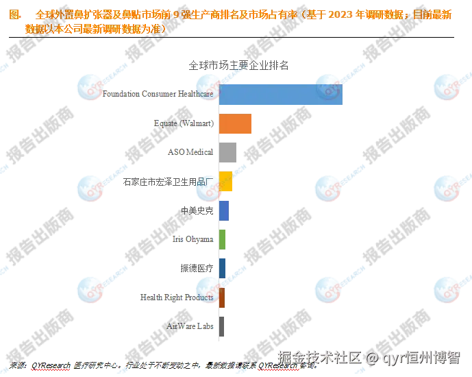 根据QYResearch头部企业研究中心调研,全球范围内外置鼻扩张器及鼻贴生产商主要包括Foundation Consumer Healthcare、Equate (Walmart)、ASO Medical、石家庄市宏泽卫生用品厂、中美史克等。2023年,全球前四大厂商占有大约215.0%的市场份额。
