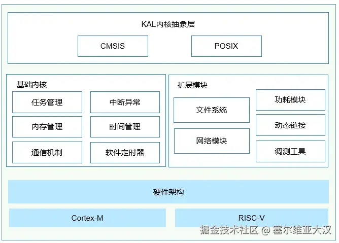 OpenHarmony采用了多内核结构,支持Linux和LiteOS,开发者可按不同产品规格进行选择使用。Linux和LiteOS均具备上述组成单元,只是实现方式有所不同。多个内核通过KAL(Kernel Abstraction Layer)模块,向上提供统一的标准接口。