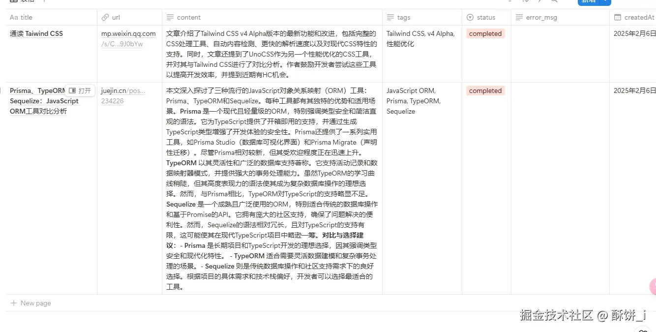 不知道你们是不是和我一样,收藏夹里堆满了各种"稍后阅读"——技术文档、行业报告、深度长文...每次点开收藏夹都像在玩考古挖掘,明明记得某篇文章提到过关键概念,却死活找不到它被埋在哪层"地质结构"里。更让人头大的是,现在大模型虽然能联网读文章,但每次只能处理单篇内容。深受此烦恼,我就做了这么个小工具,借助大模型的能力,帮助总结文章重点并打上标签,方便后期快速定位。至于存储,我选择了Notion,利用它的数据库功能实现分类和检索。你猜怎么着,这一套组合拳下来完全免费搭建!