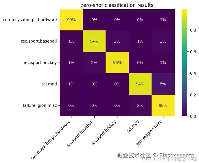 因此,零样本分类结果非常出色。即使在训练数据中没有为模型提供标签,只提供了聚类数量,在样本数据中,k-means 模型在分配聚类编号时提供了超过 94% 的准确率: