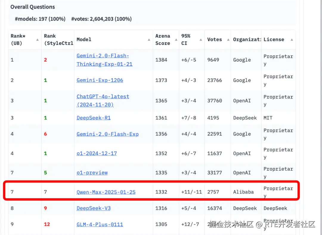 根据 Chatbot Arena LLM Leaderboard 最新一期的榜单显示,1 月 29 日,阿里云发布的 Qwen2.5-Max 进入榜单前十,超越 DeepSeek V3, o1-mini 和 Claude-3.5-Sonnet 等模型,以 1332 分位列全球第七。