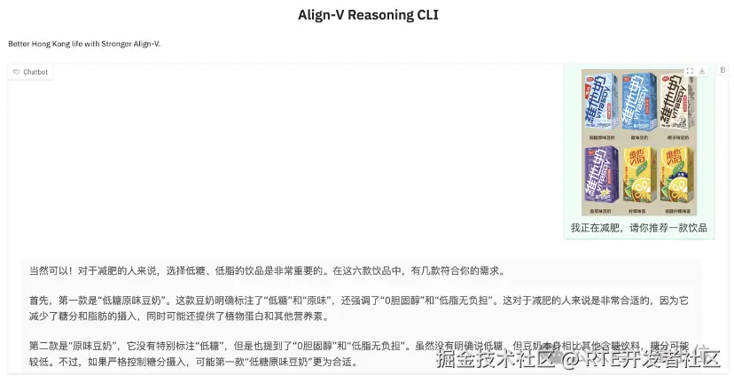 当图文结合地询问它减肥时更适合喝哪一款饮品时,Align-DS-V 精确地指出图中饮品的款数、饮品名称,以及减脂时最适合饮用的是「低糖原味豆奶」。