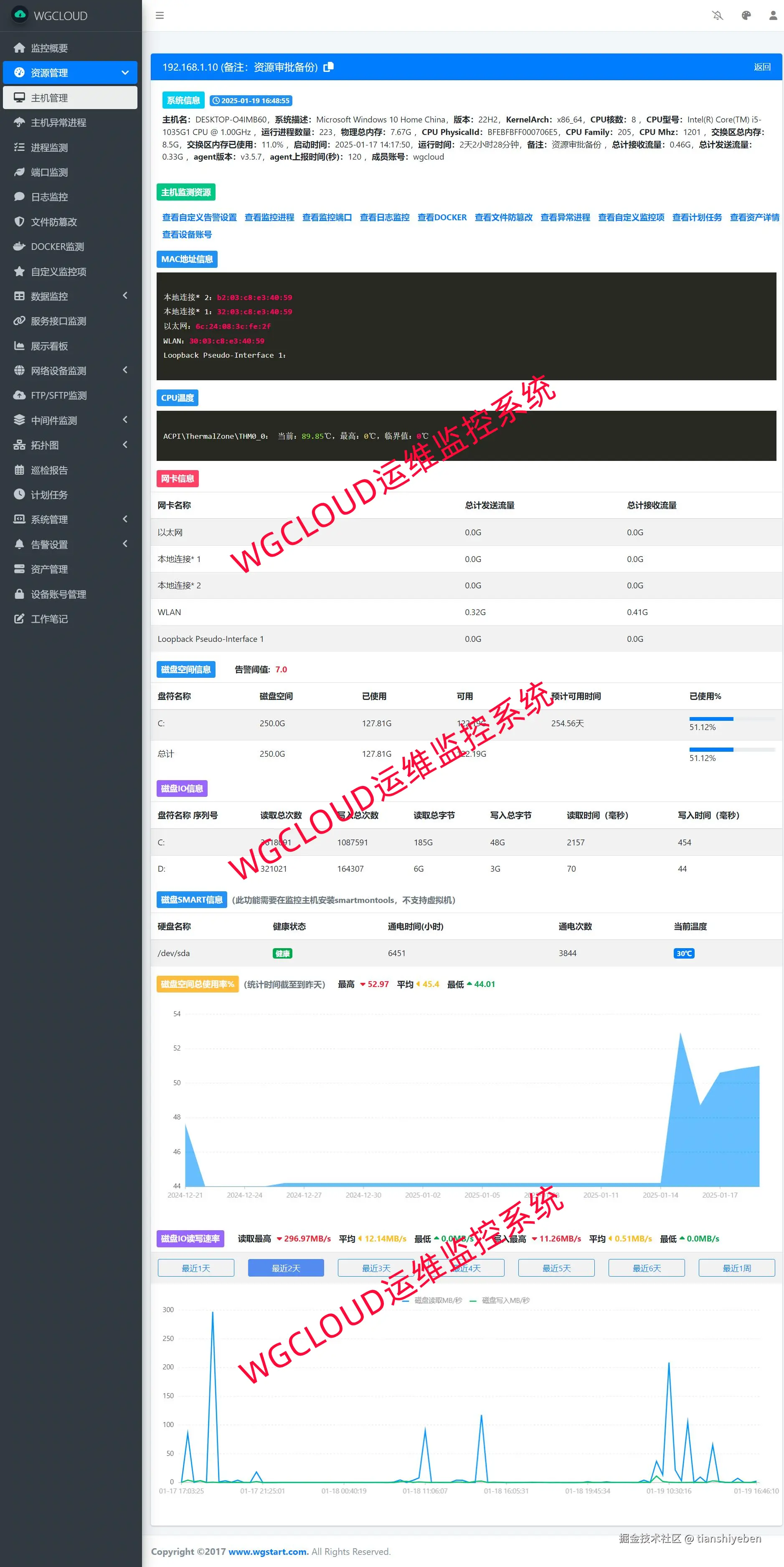 如何使用WGCLOUD监测硬盘容量 tianshiyeben 2025-02-06 87 阅读1分钟 WGCLOUD运维监控系统,可以支持监控磁盘的容量空间使用率,如果磁盘的使用率超过设置的告警阈值,那么就会发送告警通知