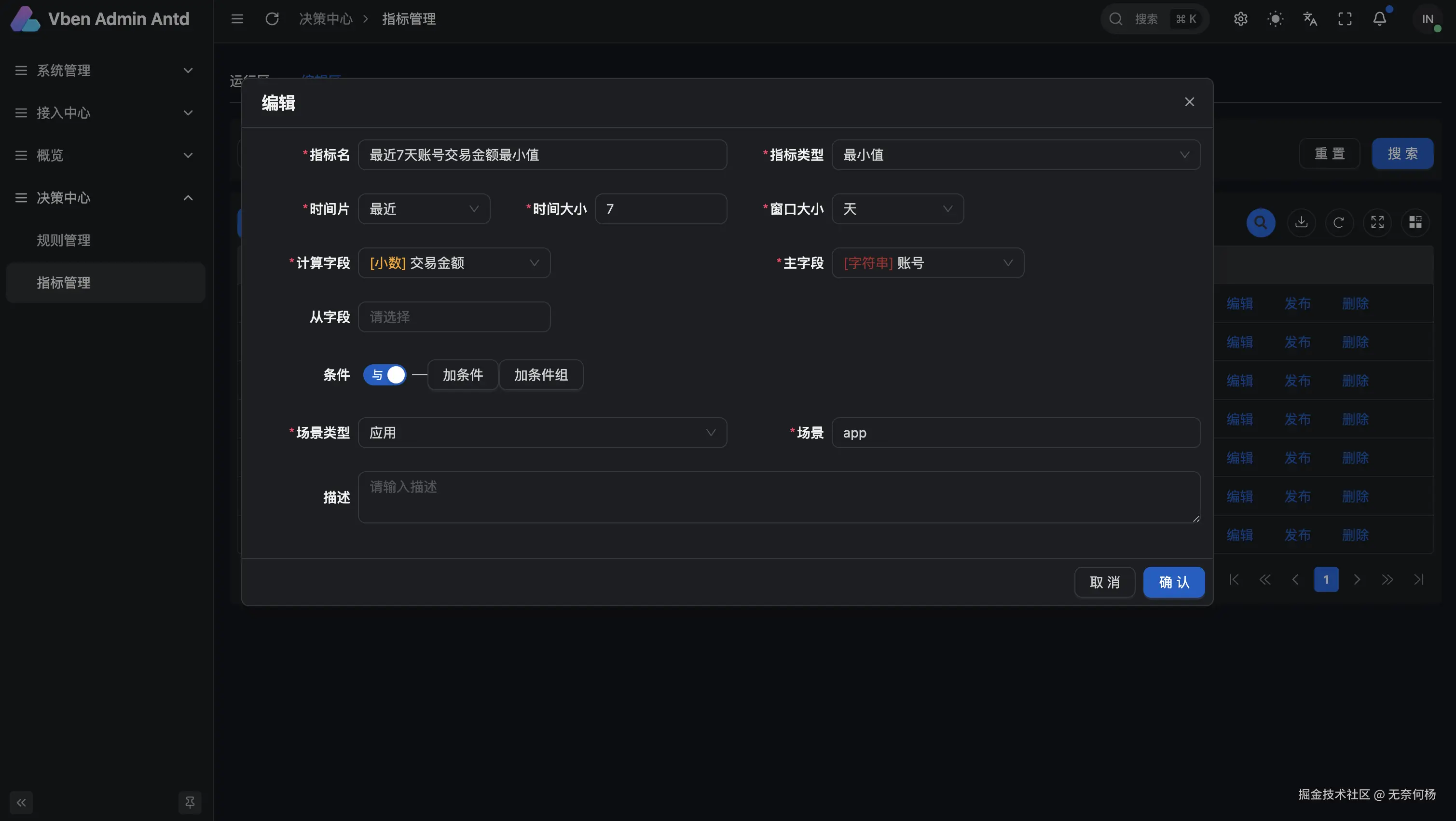 这个其实在这篇文章《风控系统之指标回溯,历史数据重跑》已经初步说明了,要么实现指标回溯,那么编辑时所有字段是可以更改的,要么就不让更改。什么意思呢?目前所有指标都是流式计算而来的,如果某个字段更改,那么流式计算的结果将不准确。