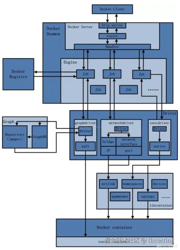 - Docker 引擎(Docker Engine) :执行具体任务(如创建容器、网络配置),通过驱动模块与操作系统交互。