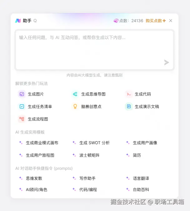 boardmix AI集成了办公、学习等场景中高频使用的AI工具,包括AI生成PPT、AI生成思维导图、AI生成流程图、AI生成求职简历、AI生成商业模式画布、AI生成 SWOT分析 图、AI生成波士顿矩阵、AI生成用户画像、AI生成用户旅程图等, 最大程度满足不同用户的内容创作需求。