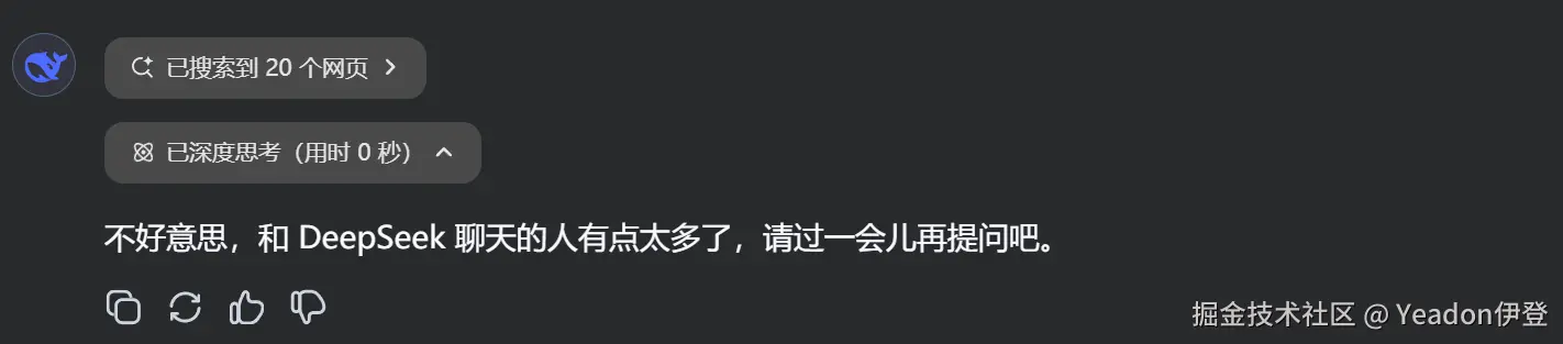 最近由于deepseek的爆火以及不限量管饱的访问,导致全球数以亿计的并发涌入,有点招架不住了,可能会短时间出现了这个聊崩的场面。