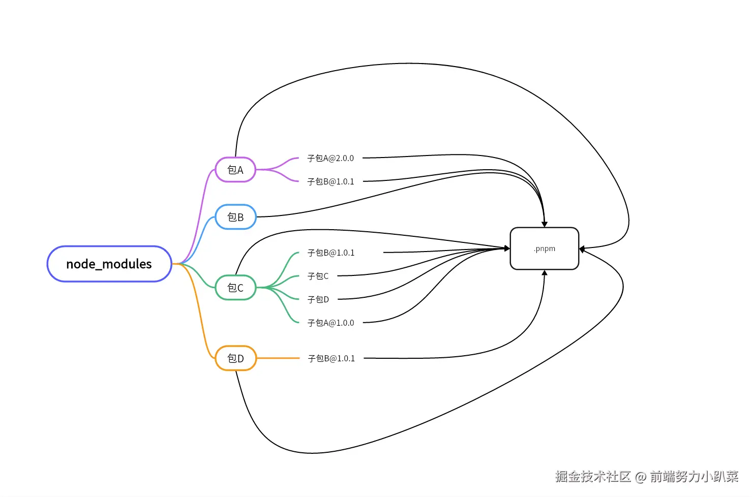 pnpm 解决了 npm 的幽灵依赖问题,我们来看是如何解决的,npm 为了解决路径长的问题,将依赖拍平处理,导致有些包被提到了顶层的 node_modules 文件夹中,解决幽灵依赖的问题,只要这些包不在顶层就可以了。 pnpm 既要使用扁平化的处理方式,又不能提到顶层。那就将所有的依赖放到一个文件夹 .pnpm 中,然后通过软链接的方式,将依赖链接到项目中。这样我们项目直接的依赖还是放在顶层,通过软连接的方式去链接到 .pnpm 文件夹中。这些依赖的子依赖还会保持原来的依赖树关系,只是都使用软连接到 .pnpm 文件夹中。