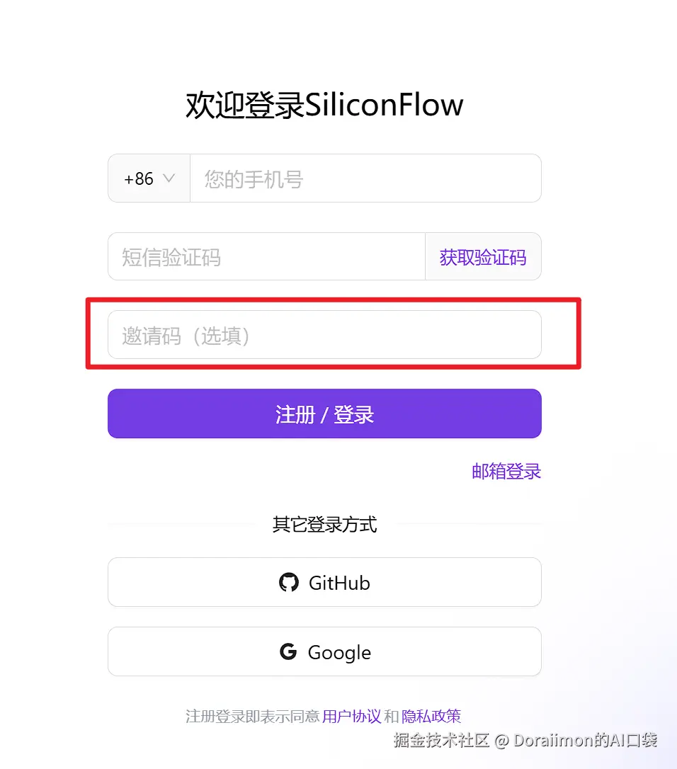 - 到官网 account.siliconflow.cn/login 注册硅基流动,注册时切记要填入邀请码:f3z60yFw