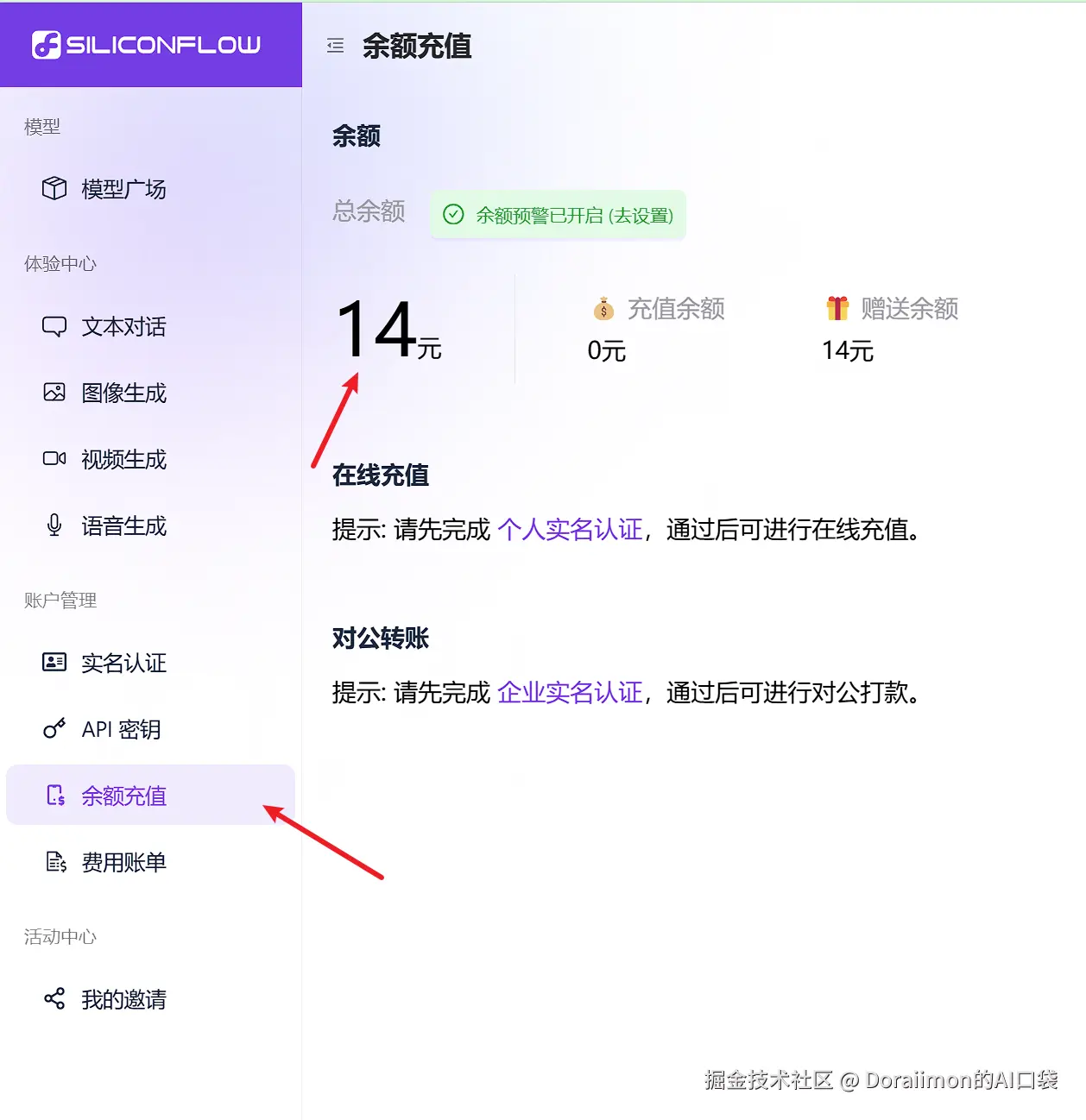 注册成功后,在余额充值中,可以看到自己的有14元的余额,就证明已经白嫖成功了