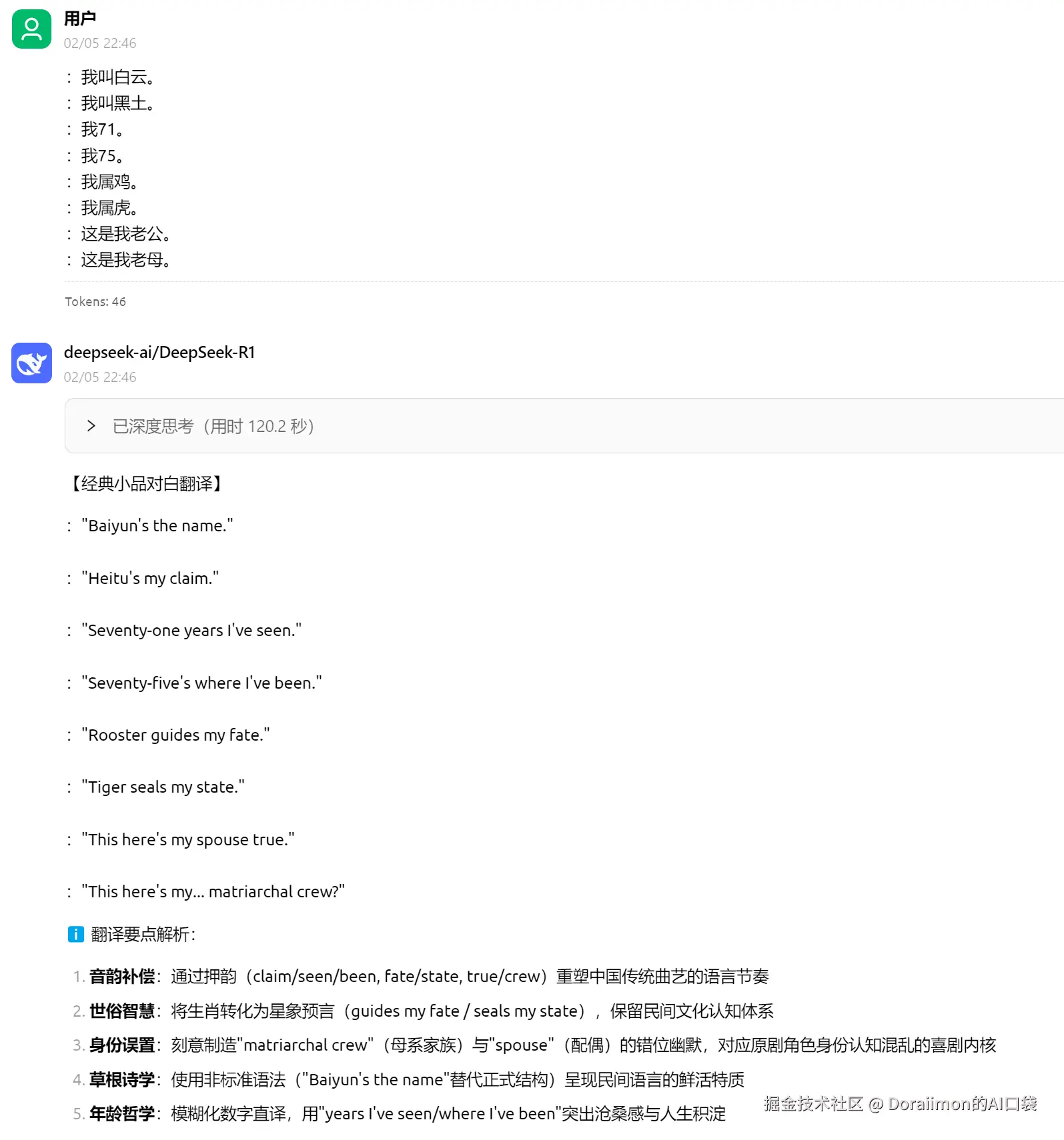 可以看到DeepSeek分析出来了这段对话的灵魂之处:押韵。并且严格按照押韵来翻译,效果简直炸裂!!!