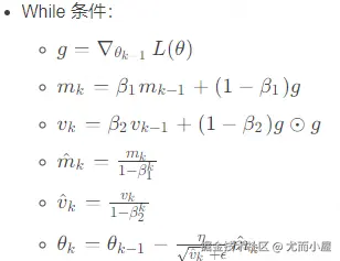 其中,分别是梯度的一阶矩和二阶矩的估计,是控制两个矩估计得指数衰减率,范围在0到1之间,通常设置为0.9和0.999。是个非常小的数(例如1e-8),防止除数为零。k是当前迭代的次数,用于做偏差校正。
