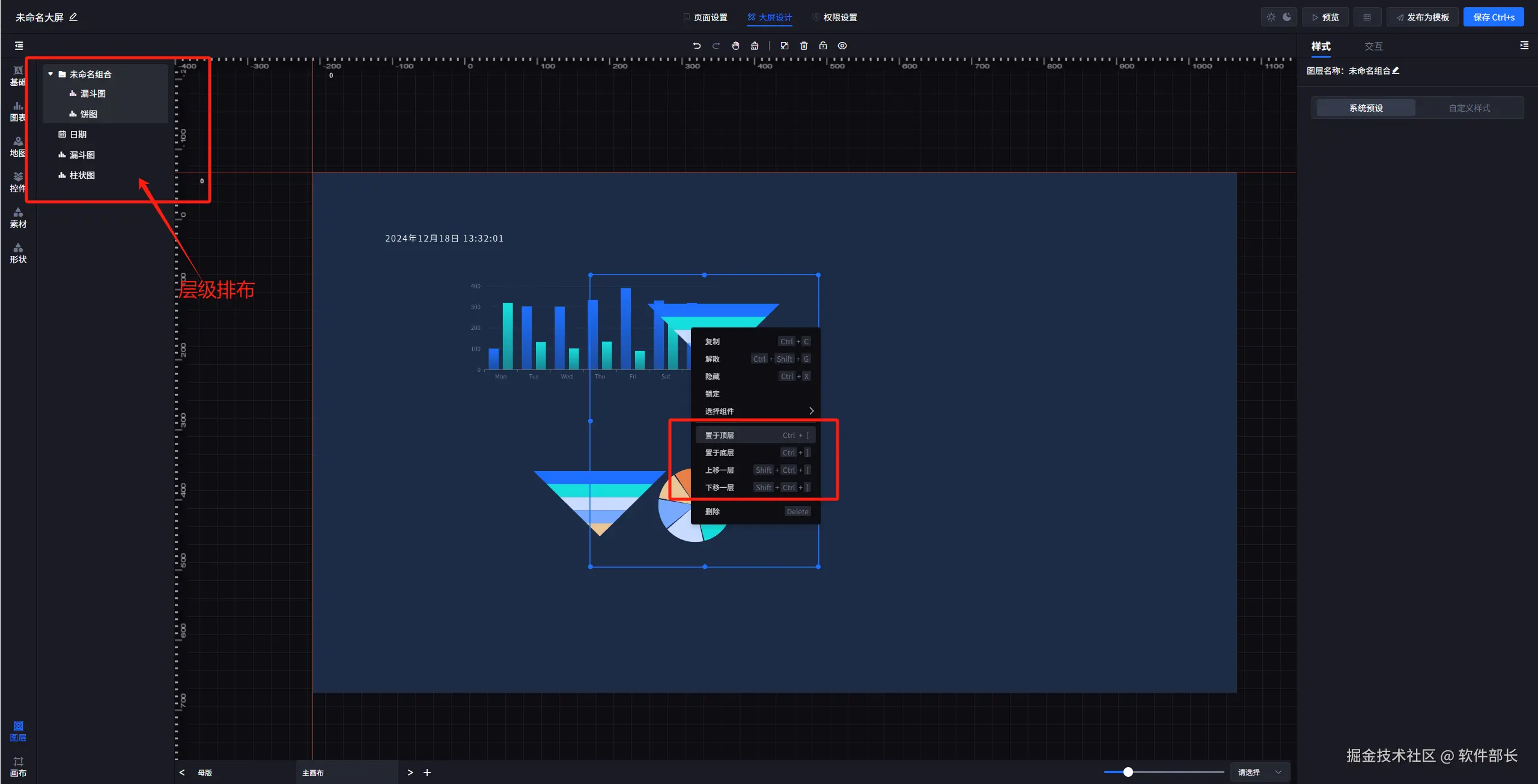 组件之间是按照层级的方式进行排布,不同层级的组件可以在左侧的层级目录中拖拽调整上下排序,也可以在画布中通过邮件设置选中对象的层级,支持群组的统一操作