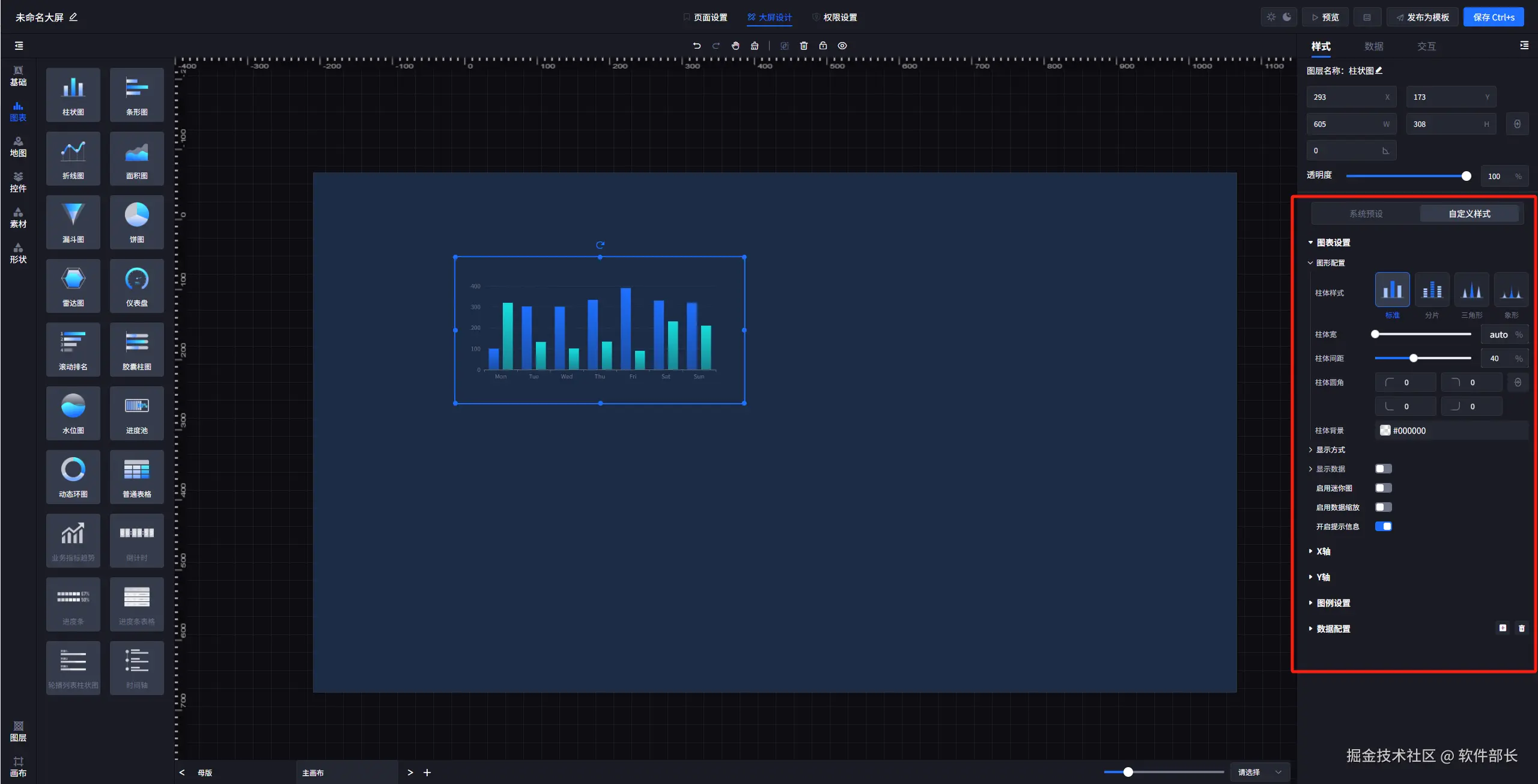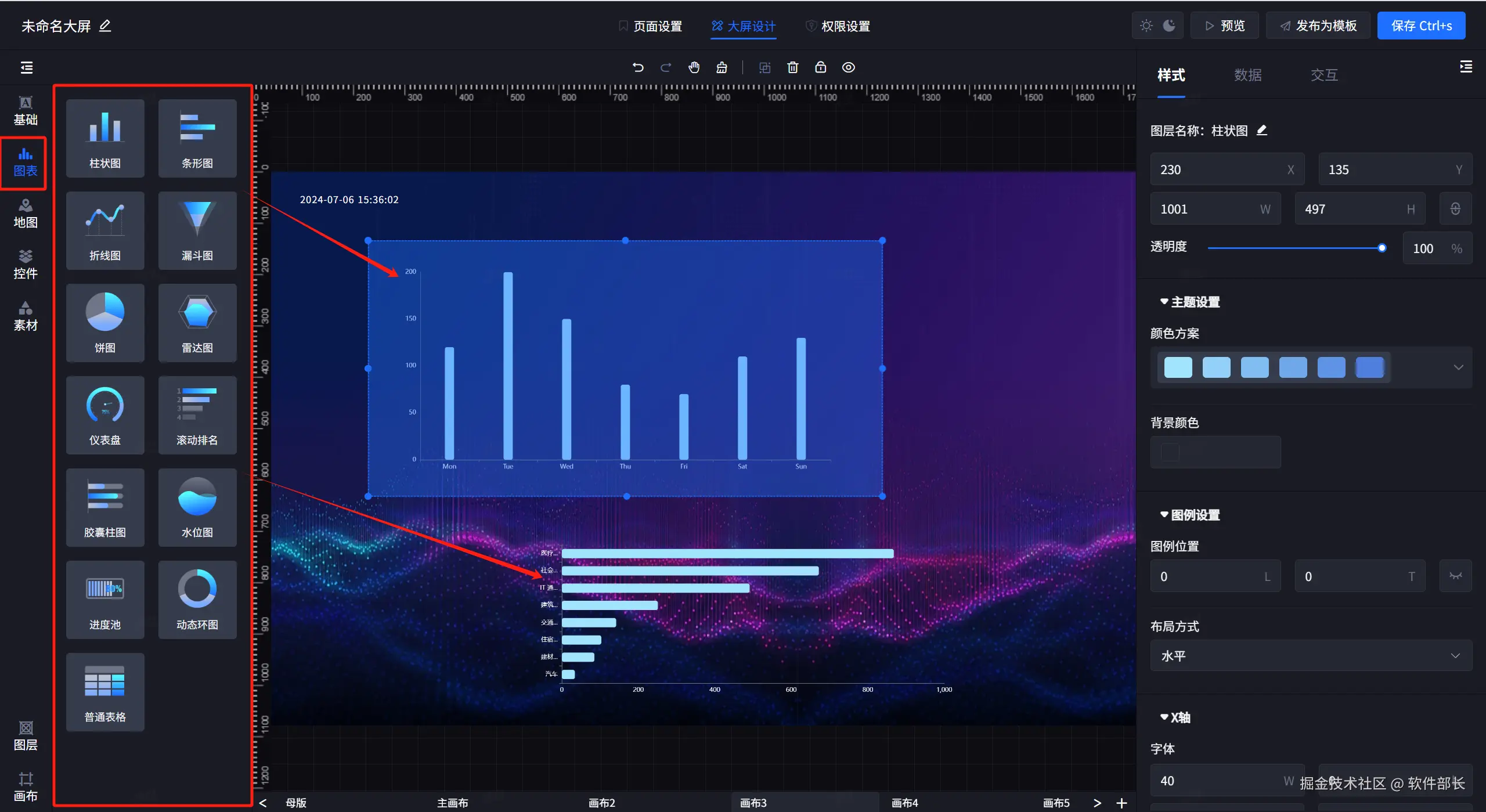 例如上图所示的柱状图,那么还包括配色方案、背景颜色配置、图例设置、X轴、Y轴等具体配置。