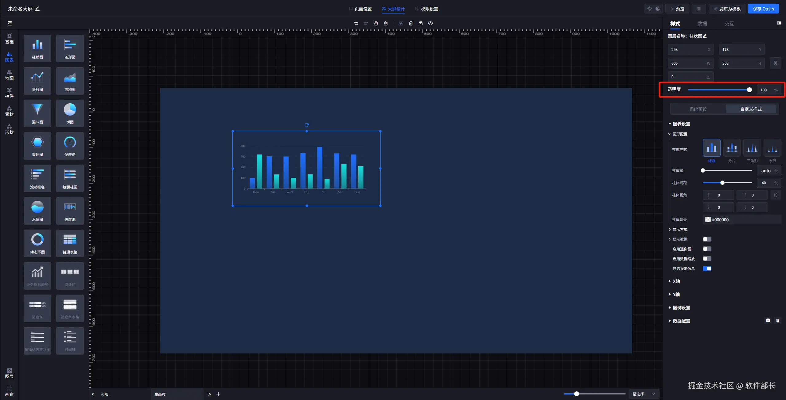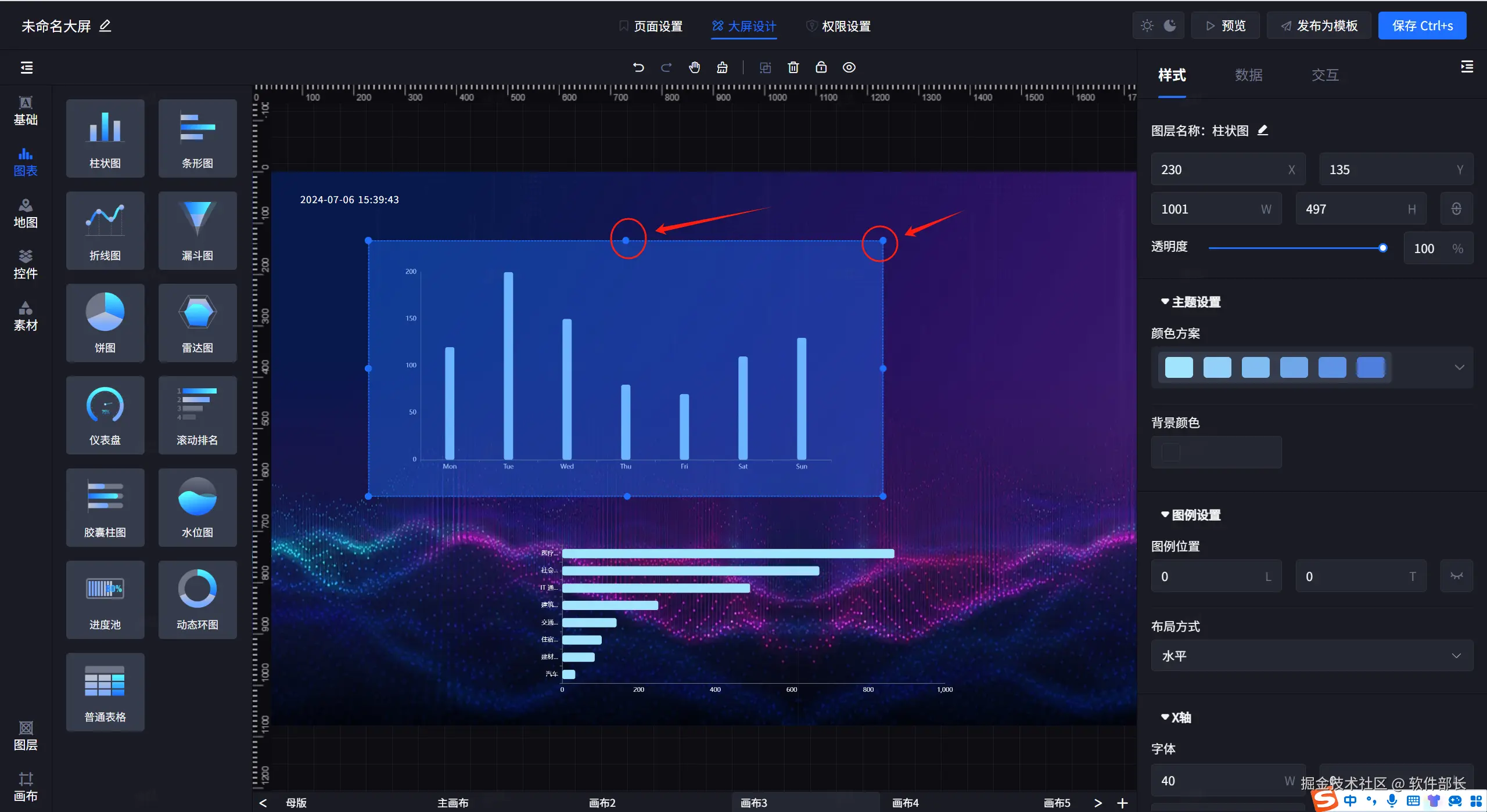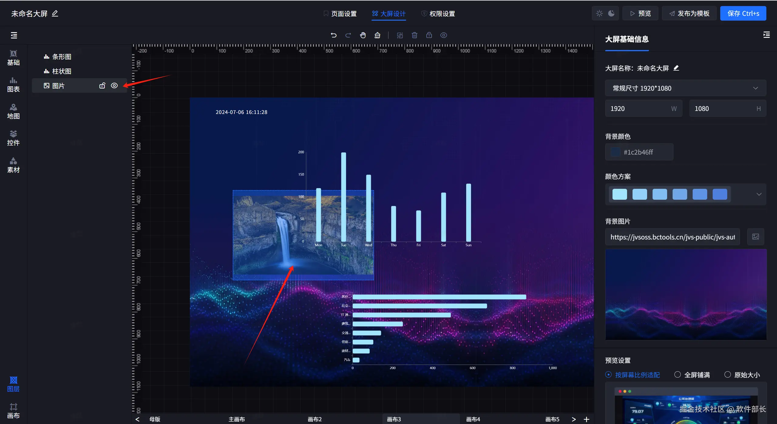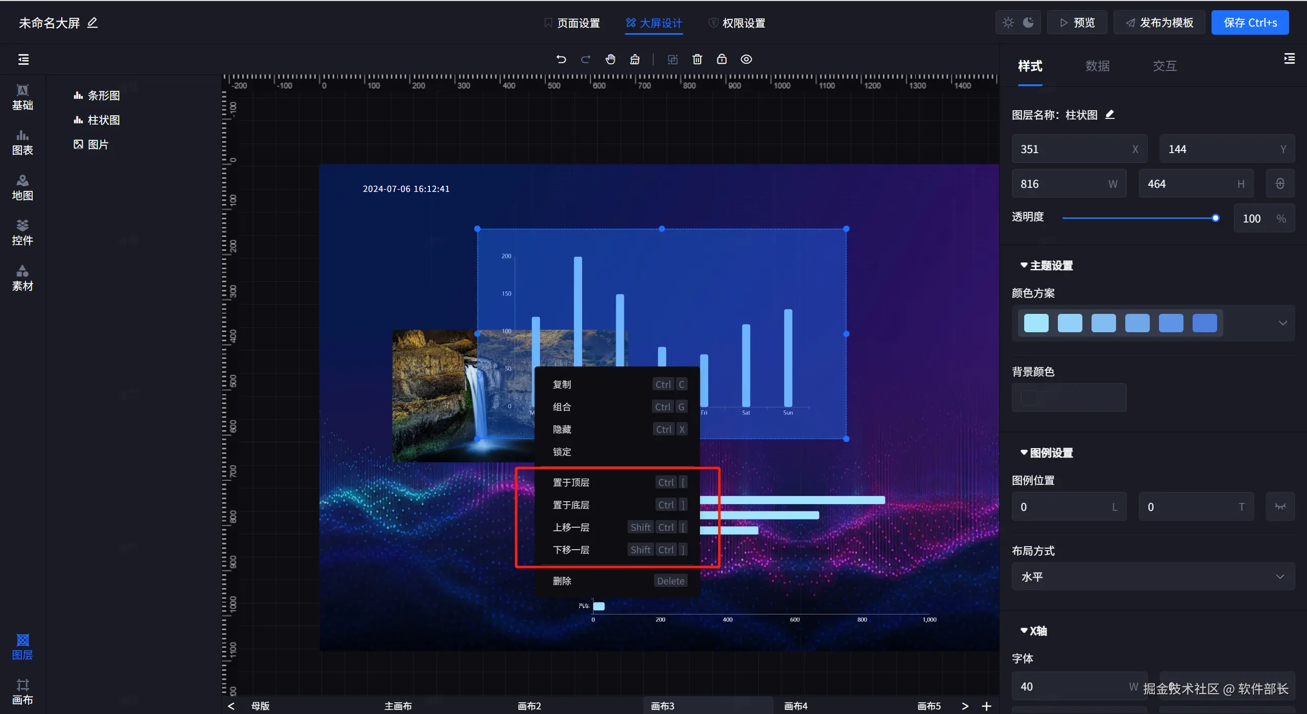 拖动组件的层级变化或者右键控制组件的层级,那么我们可以看到层级的效果,图片放入底部后,柱状图则在图片上方