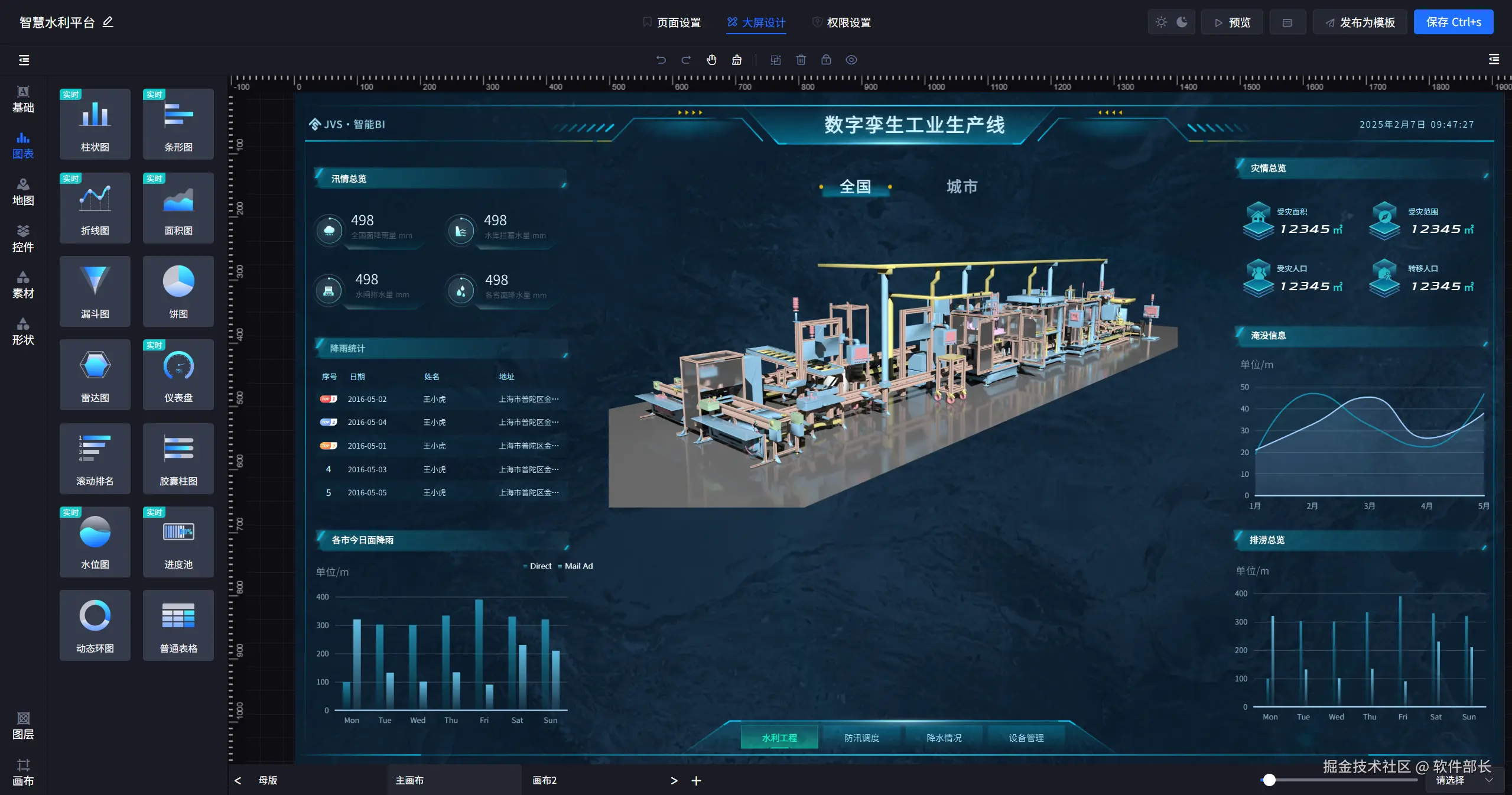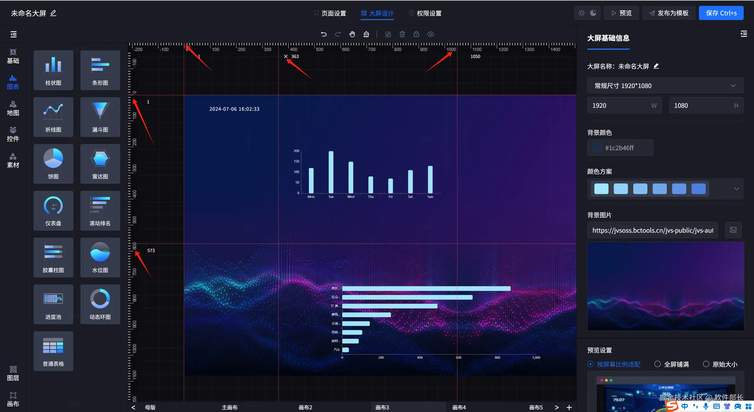 数字化时代,数据可视化大屏是信息呈现和交流的方式之一。可视化大屏可以直观、高效地展示数据,不同类型的组件在大屏设计器中扮演着至关重要的角色。JVS-智能BI的可视化大屏中,提供了丰富的大屏组件,包括:图表、地图、控件、图形等等。接下来我将详细介绍组件的配置与调整方法,包括组件的选择与预览、位置与大小的调整、辅助对齐技巧、样式配置选项、组件的层叠与群组管理等功能。
