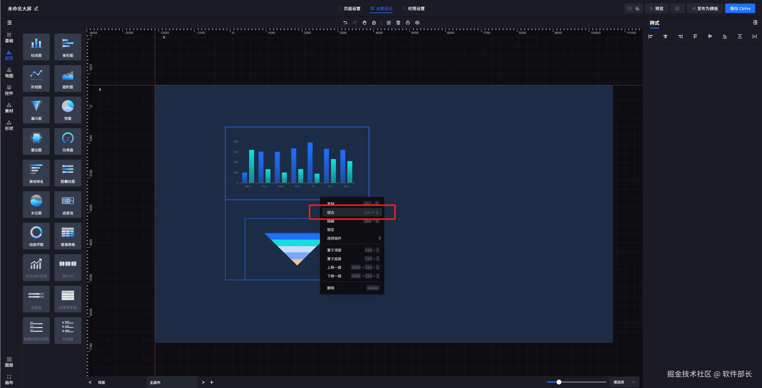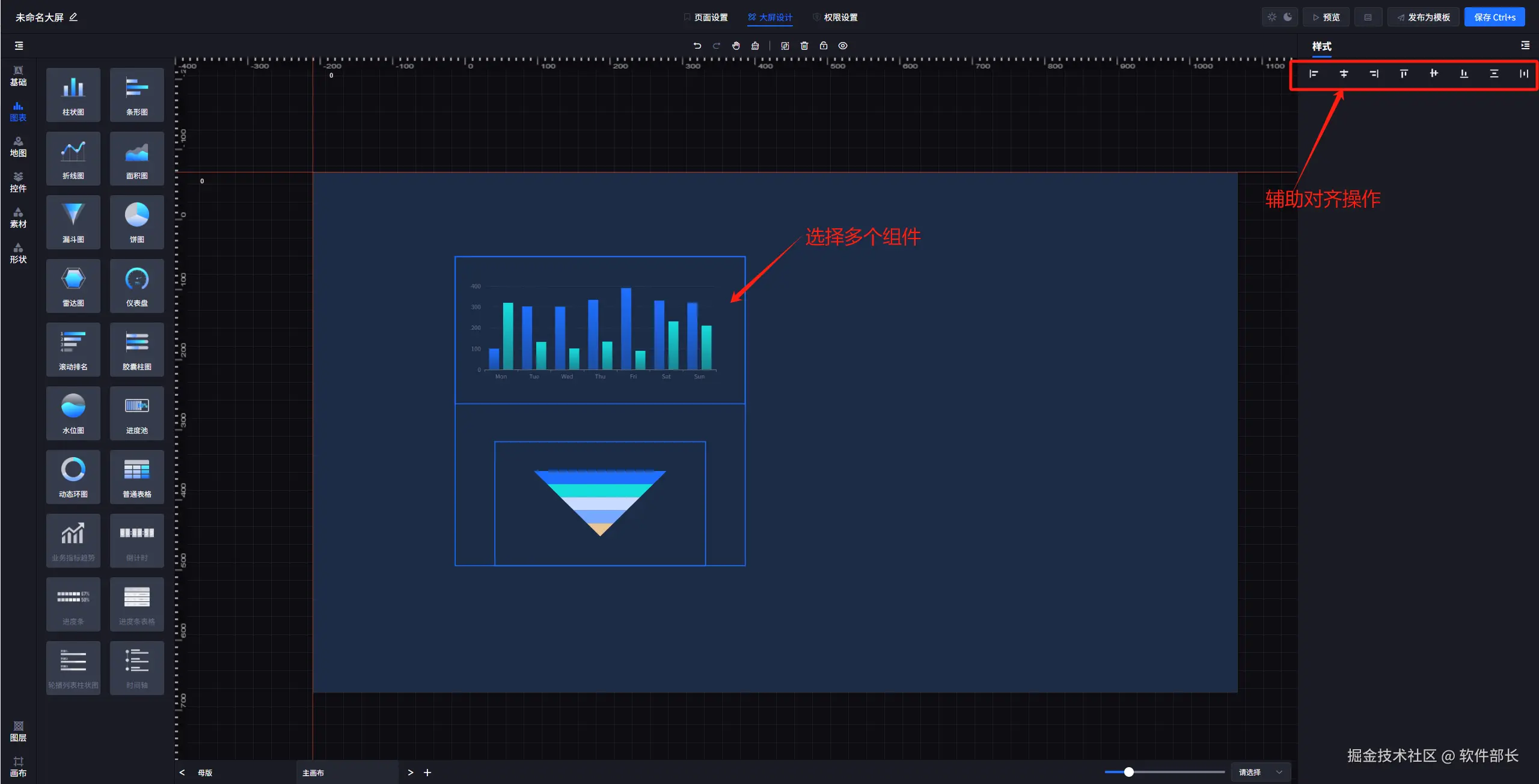 对组件的位置配置,还可以通过对多个组件对齐的方式调整位置,如下图所示,选中多个组件,系统会自动展示对多个组件的样式配置,这里主要包括对齐的便捷操作,这种操作会更加精确。