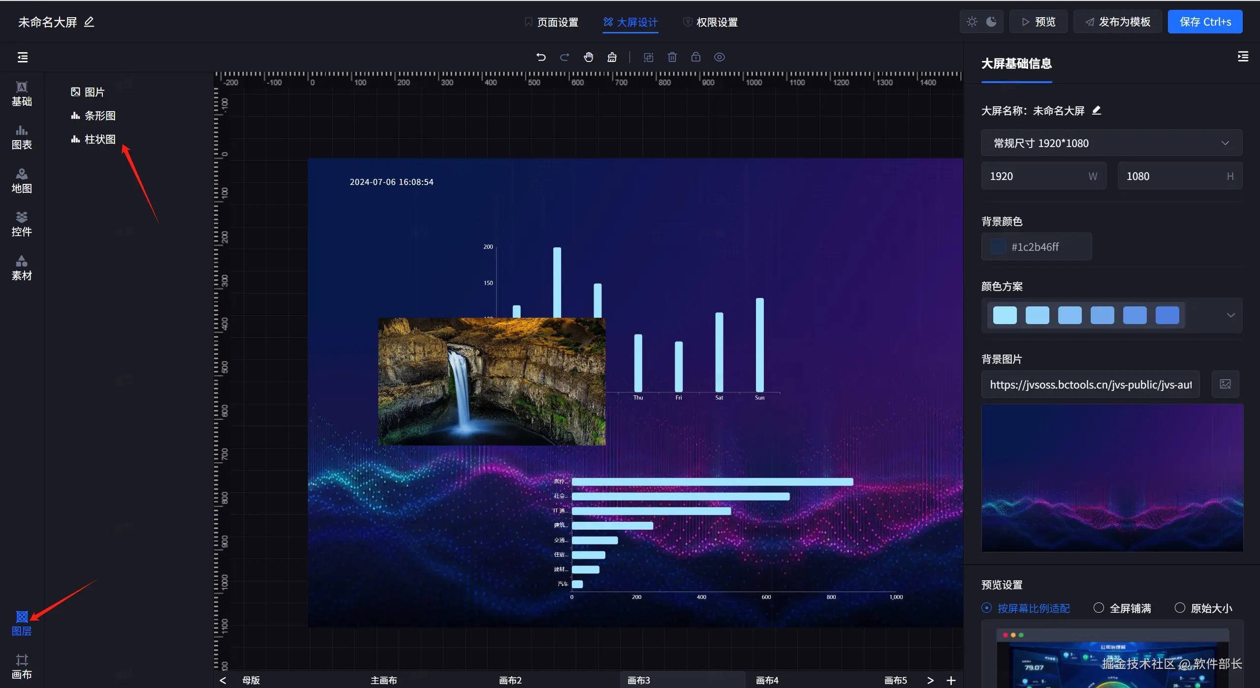组件与组价是可以通过堆叠展示的,点击图层时,可以看到本页面上的各个组件的 层级堆叠情况,如下图所示,从左侧的组件堆叠的情况看,“图片”组件是在“柱状图”的上方,