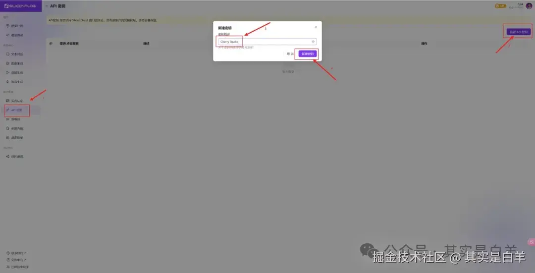 需要先在【后台 - API密钥】先创建一个密钥,然后复制下来